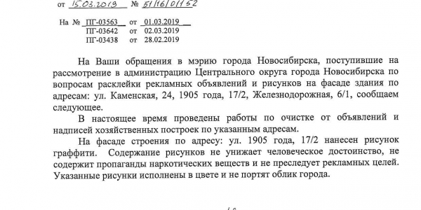 Номер жалобы:50329 Тип жалобы:Иные проблемы ЖКХ Название объекта: Регион:Новосибирская область Город:Новосибирск Адрес:Каменская улица, 24 Описание жалобы:Объявления на хозяйственном корпусе Статус: