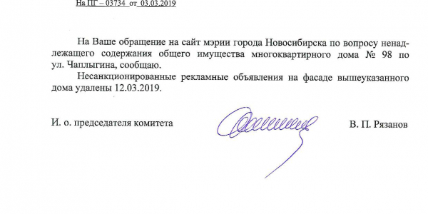 Номер жалобы:50331 Тип жалобы:Иные проблемы ЖКХ Название объекта: Регион:Новосибирская область Город:Новосибирск Адрес:улица Чаплыгина, 98 Описание жалобы:Объявления на фасаде дома Статус: