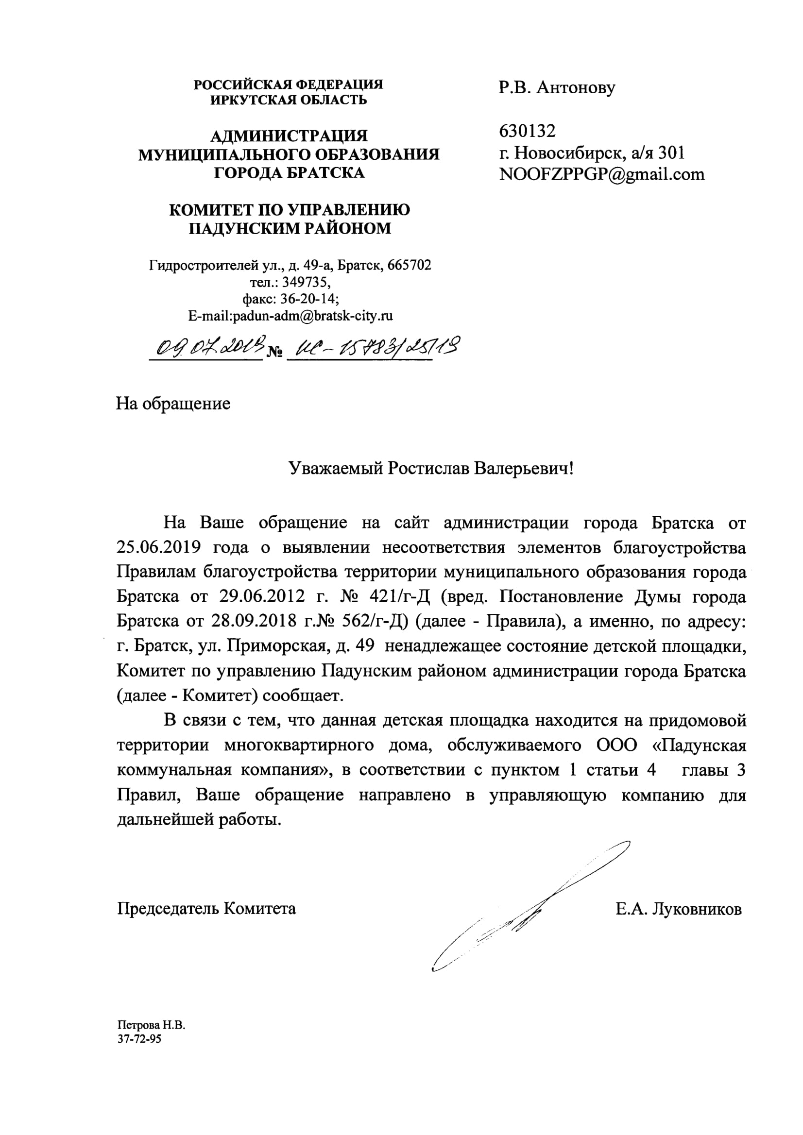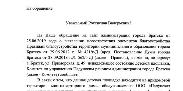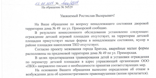 Номер жалобы:56529 Тип жалобы:Прочее Название объекта: Регион:Иркутская область Город:Братск Адрес:Приморская улица, 49 Описание жалобы:Не огражденная детская площадка от проезжей части ,на территории детской площадки стоит трансформаторная будка и помойка!! Дети бегают вокруг трансформаторной будки , около помойки , где валяются шприцы и стекла и т.д! Разрушенный детский столик! Детская площадка старая! Статус: