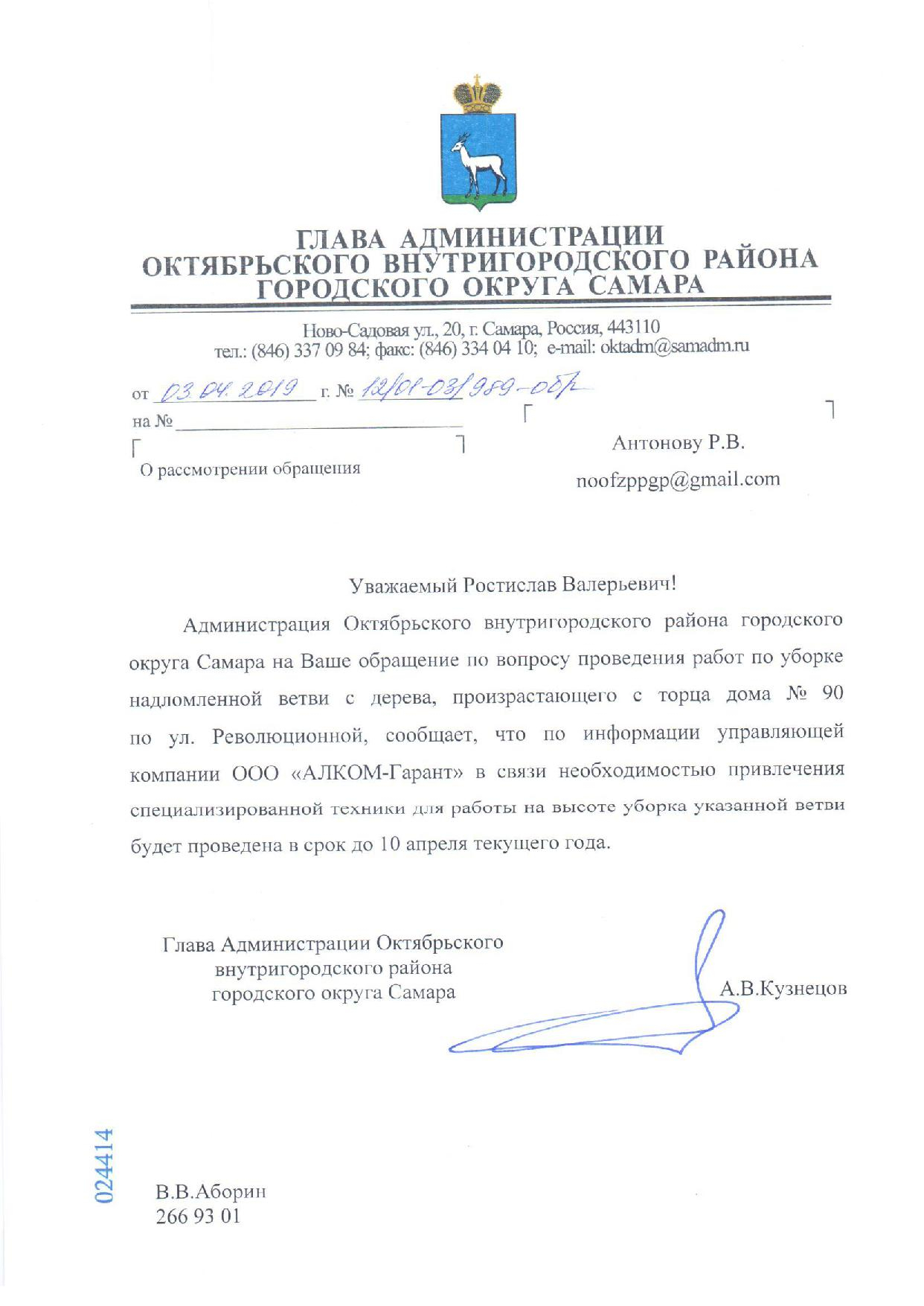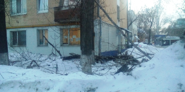 Номер жалобы:50305 Тип жалобы:Городская среда Название объекта: Регион:Самарская область Город:Самара Адрес:Революционная 90 Описание жалобы:Сухая вершина тополя упала на днях после сильной метели возле дома, со стороны улицы Артемовская. По счастью никто не пострадал и ничего не повреждено. Утром люди убрали с отмостки дома куски древесины и сучки. Но основная масса осталась висеть в воздухе, зацепившись за сучки других деревьев. Сейчас это представляет огромную опасность для проходящих про придомовой дорожке людей. Небольшой ветер и бревно упадет на голову случайным прохожим. В торце здания находится магазин и жители дома регулярно ходят туда, подвергаясь опасности. Статус: