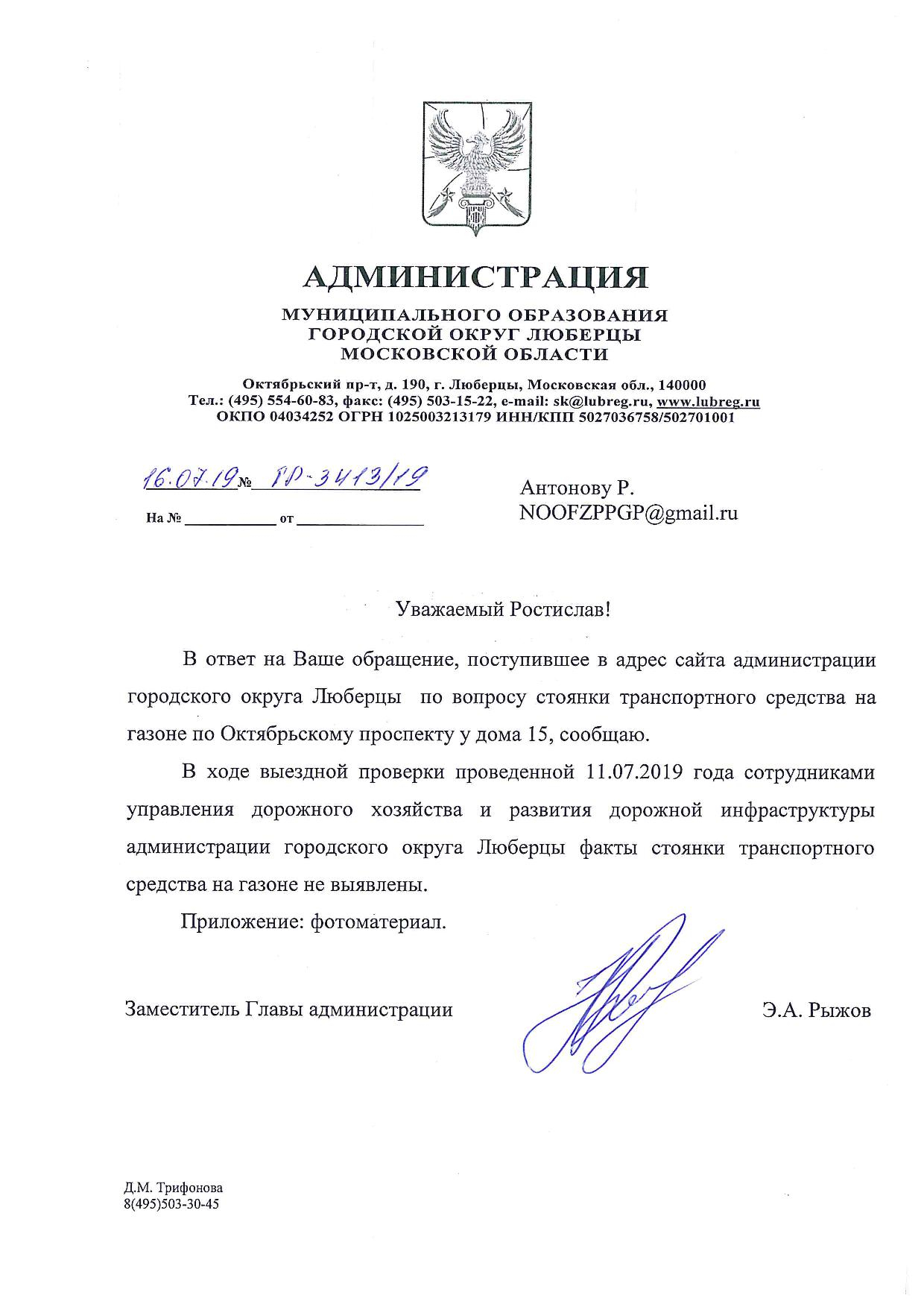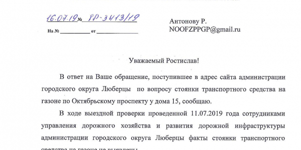 Номер жалобы:56409 Тип жалобы:Прочее Название объекта: Регион:Московская область Город:Люберцы Адрес:Октябрьский проспект, 15 Описание жалобы:Парковка на газоне Статус: