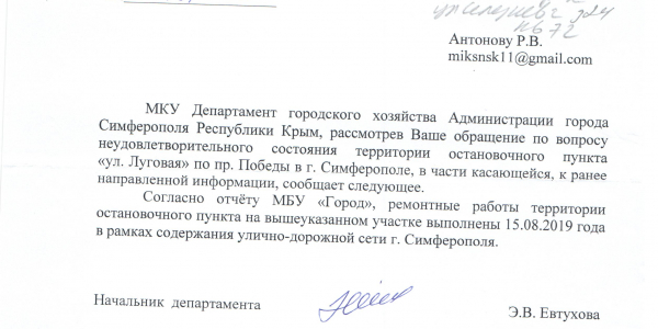 Номер жалобы:56393 Тип жалобы:Прочее Название объекта: Регион:Республика Крым Город:Симферополь Адрес:проспект Победы, 103 Описание жалобы:1. Не огражден перепад по высоте- сломано ограждение более 2 м, 2. разрушена плитка на остановке, 3 скамейка на остановке на высоте более 70 см, что недопустимо.