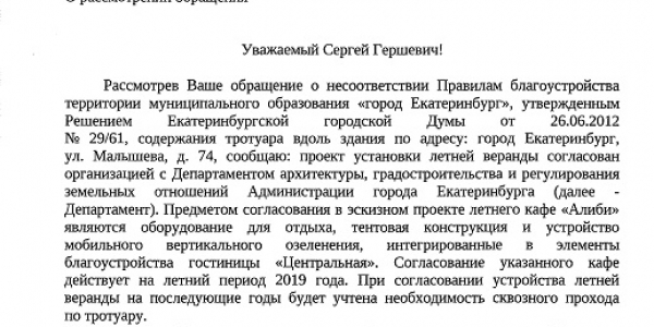Номер жалобы:56411 Тип жалобы:Прочее Название объекта:Мэрия Регион:Свердловская область Город:Екатеринбург Адрес:улица Малышева, 74 Описание жалобы:У бара «Алиби» сквозной проход по половине тротуара, примыкающей к фасаду, перегорожен вазоном. По данной проблеме обращался в жалобе 54760. В ответе администрации сообщается, что вазоны убраны. В действительности сквозной проход открыт не был. Статус: