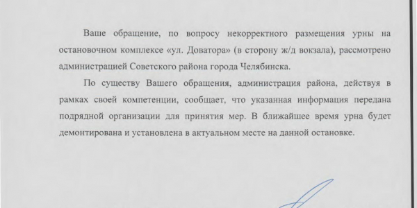 Номер жалобы:56414 Тип жалобы:Прочее Название объекта:Администрация Советского района г.Челябинска Регион:Челябинская область Город:Челябинск Адрес:улица Доватора, 35 Описание жалобы:1246-19 На остановочном комплексе (ост.Ул.Доватора в сторону ж/д вокзала) отсутствует урна (мусороприемник). Людям приходится выбрасывать мусор куда попало, т.к.муниципальная урна (металлоконструкция с пакетом) установлена на 20 метрах от места ожидания людей транспорта и практически не используется. Продублируйте пожалуйста урну (мусороприемник) там, где это необходимо, или перенесите ее. Статус: