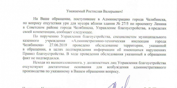 Номер жалобы:56296 Тип жалобы:Прочее Название объекта: Регион:Челябинская область Город:Челябинск Адрес:проспект Ленина, 27 Описание жалобы:Нет ни одной мусорки около магазинов Статус: