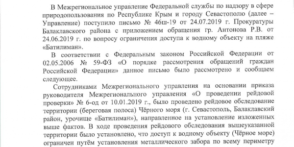 Номер жалобы:56297 Тип жалобы:Прочее Название объекта: Регион:Севастополь Адрес:урочище Батилиман Описание жалобы:ограничен доступ к морю на пляже возле базыотдыха Батилиман, координаты 44.418060, 33.680984.