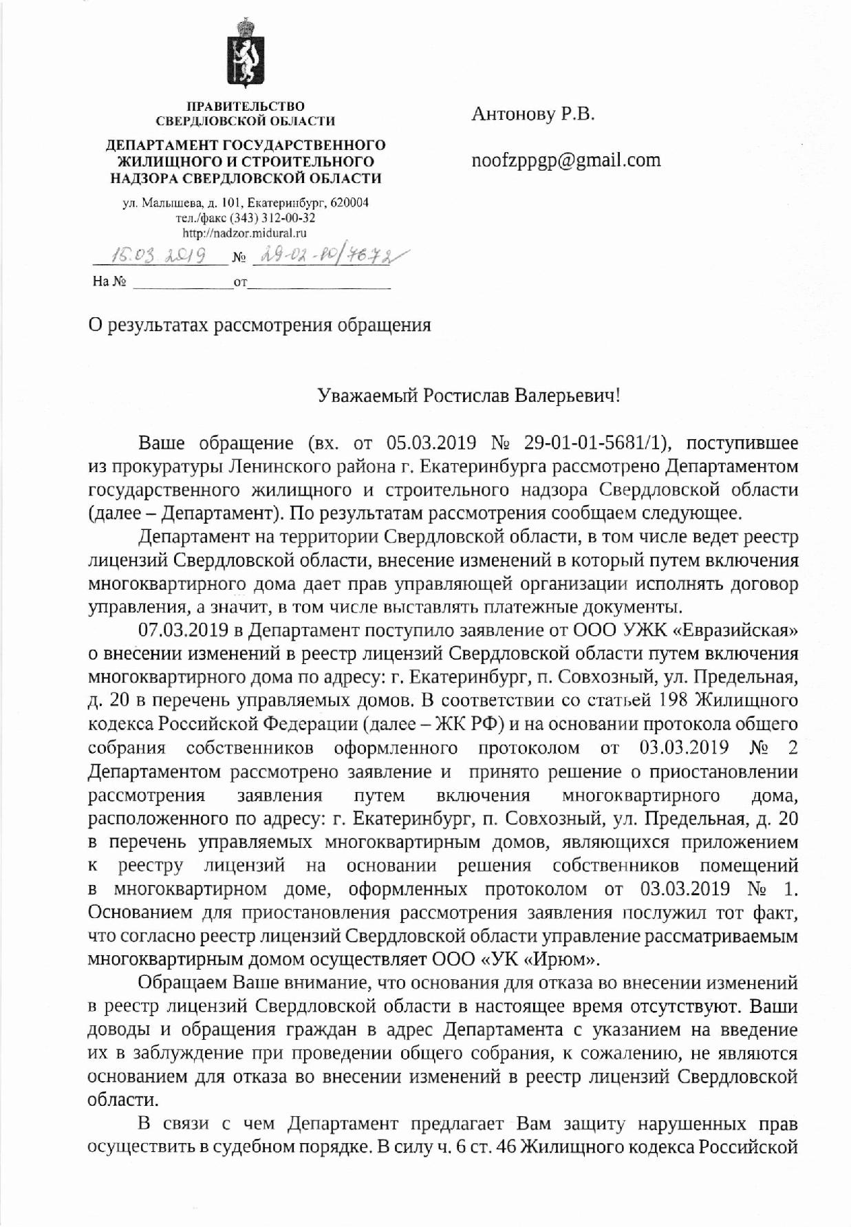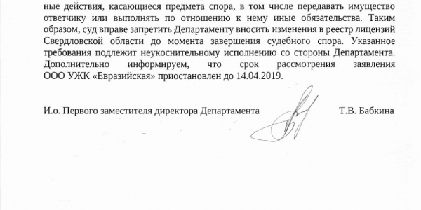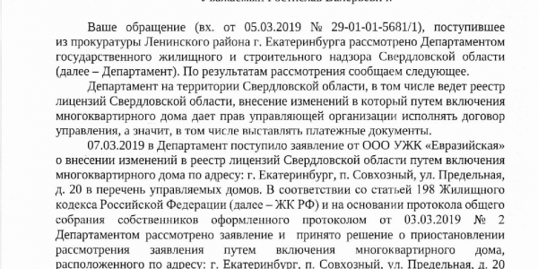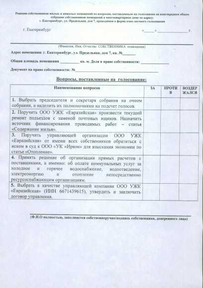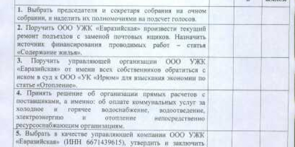 Номер жалобы:49617 Тип жалобы:Иные проблемы ЖКХ Название объекта:ООО УЖК "Евразийская" Регион:Свердловская область Город:посёлок Совхозный Адрес:Предельная улица, 20 Описание жалобы:Мошенничество. Представители этой компании ходят по нашему району и вводя в заблуждение просят подписать этот бланк. Говорят, что по их договору с УК Ирюм они просто будут делать ремонт в подъезде. А по факту просят передать им все полномочия. Ситуация такая: не сразу разобрав ситуацию и будучи введённой в заблуждение я поставила галочки "за" в пунктах о капремонте и перерасчете оплаты отопления. Поставила галочку "против" в пункте 5 о передаче прав. Вопрос: что сейчас делать? Обратилась в УЖК "Европейская" с просьбой вернуть мне мой подписанный бланк, сказали, что вернут, но ещё не вернули. Прилагаю копию бланка, с которыми они ходят. Статус: