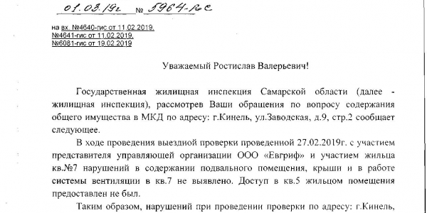 Номер жалобы:49597 Тип жалобы:Иные проблемы ЖКХ Название объекта: Регион:Самарская область Город:Кинель Адрес:Кинель, Заводская улица, 9с2 Описание жалобы:УК компания "Евгриф " отказывается ремонтировать трубы в подвале которые текут с осени ,из за их бездействия покрылось плесенью несколько квартир на первом этаже ,ссылаются на долги у жильцов Статус: