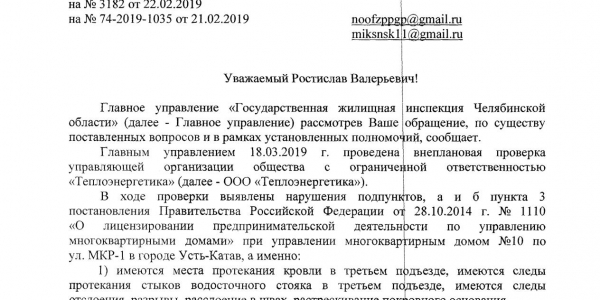 Номер жалобы:49612 Тип жалобы:Иные проблемы ЖКХ Название объекта: Регион:Челябинская область Город:Усть-Катав Адрес:1-й микрорайон, 10 Описание жалобы:Здравствуйте. В нашем подьезде 3 протекает крыша. Вся вода от дождей или тающего снега течет в подьезд и в квартиры жильцов. УК "теплоэнергетика"