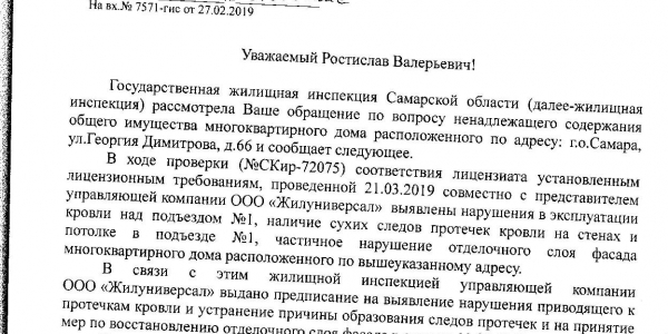 Номер жалобы:49912 Тип жалобы:Иные проблемы ЖКХ Название объекта: Регион:Самарская область Город:Самара Адрес:Самара, улица Гагарина, 165А Описание жалобы:НАША УК Компания ООО "ЖКС" ИНН 6316201681. В ноябре 2018 года перекрыли кровлю дома по адресу г. Самара, ул. Гагарина, 165а над 2 и 3 подъездами. На данный момент весь дом протекает, там где ремонт был частичный, вода попадает под высоковольтный щиток. (3 и 4 подъезд). На телефонные звонки старшей по дому с просьбой исправить ситуацию, никто не реагирует. Фото второго подъезда прикладываю. Прошу принять меры по исправлению ситуации. Статус: