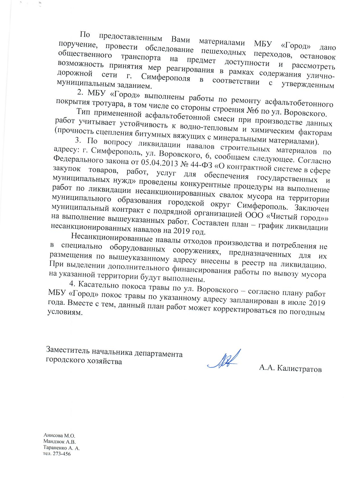Уважамая Наталья Маленко, глава г. Симферополь, обращаю Ваше внимание на нарушения действующего законодательства и элементарных правил благоустройства при проведении ремонтных работ сотрудниками МБУ " Город" ненадлежащую работу департамента адм. техн. контроля выполняюшего приемку некачественно выполненных работ, выполненных по некачественно сделаному проекту, в отсутствие каких-либо адекватных правил благоустройства на территории г. Симферополь, при полном отсутствии архитекторов и строителей в вышеуказанных и причастных к этому бардаку органов власти: