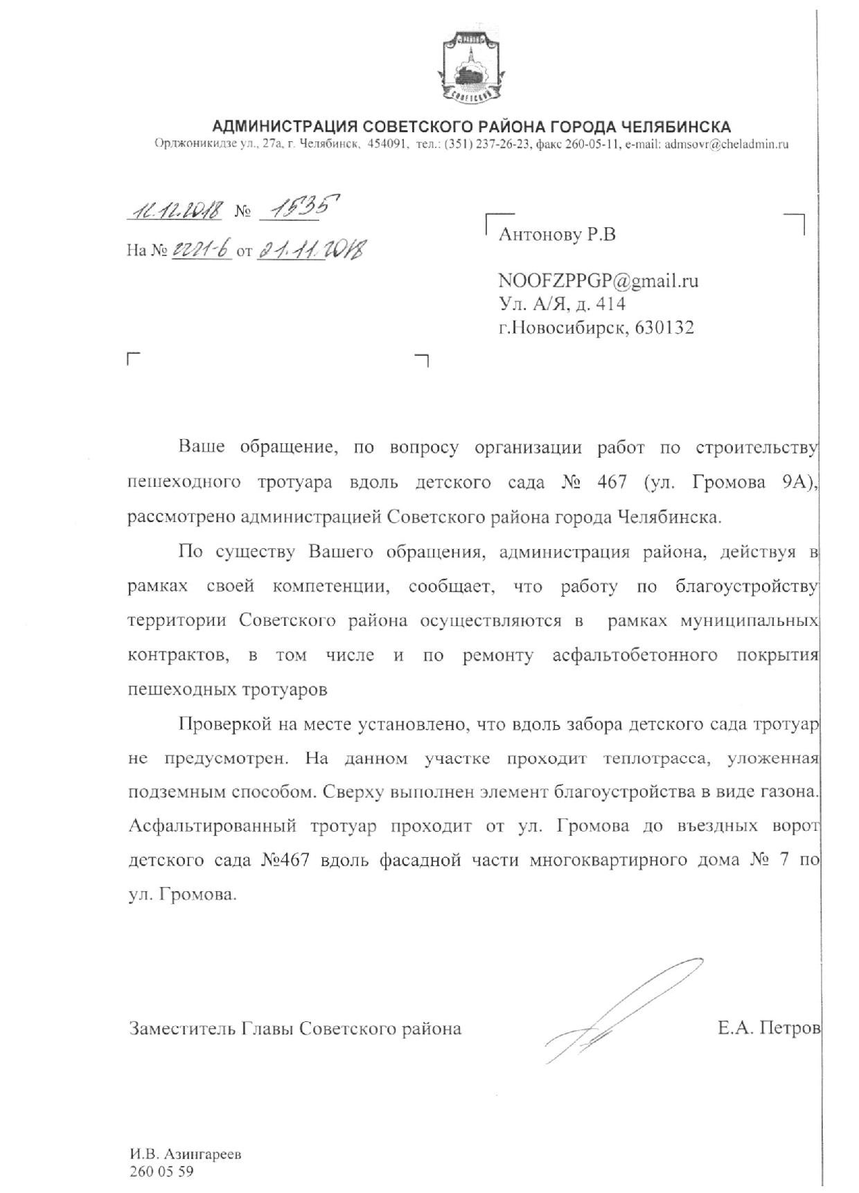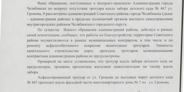 Номер жалобы:56219 Тип жалобы:Прочее Название объекта:Челябинские коммунальные тепловые сети Регион:Челябинская область Город:Челябинск Адрес:Громова улица 9А Описание жалобы:1406-11 Продолжение к жалобе 45393. По данным, предоставленным Администрацией Советского района г.Челябинска вдоль забора детского сада 467 (ул.Громова 9А) проходит подземная теплотрасса, из-за чего невозможно сделать в этом месте неширокий тротуар для жителей ближайших домов. Но есть много тротуаров и дорог, под которыми проходят теплосети. Действительно ли тротуар на месте протоптанной тропы (место расположения видно на фото) может как-то нарушить состояние подземной теплосети или помешать ее ремонту. Данный тротуар стал бы логичным продолжением тротуара, идущего вдоль дома №9 по ул.Громова и обеспечил бы комфортный доступ жителей к детскому учреждению. Просим ответить конкретно, например, что можно сделать тротуар, т.к. не будет нарушать нормы содержания теплосети или нельзя сделать тротуар, потому что...(причины с указанием пунктов в правилах). Статус: