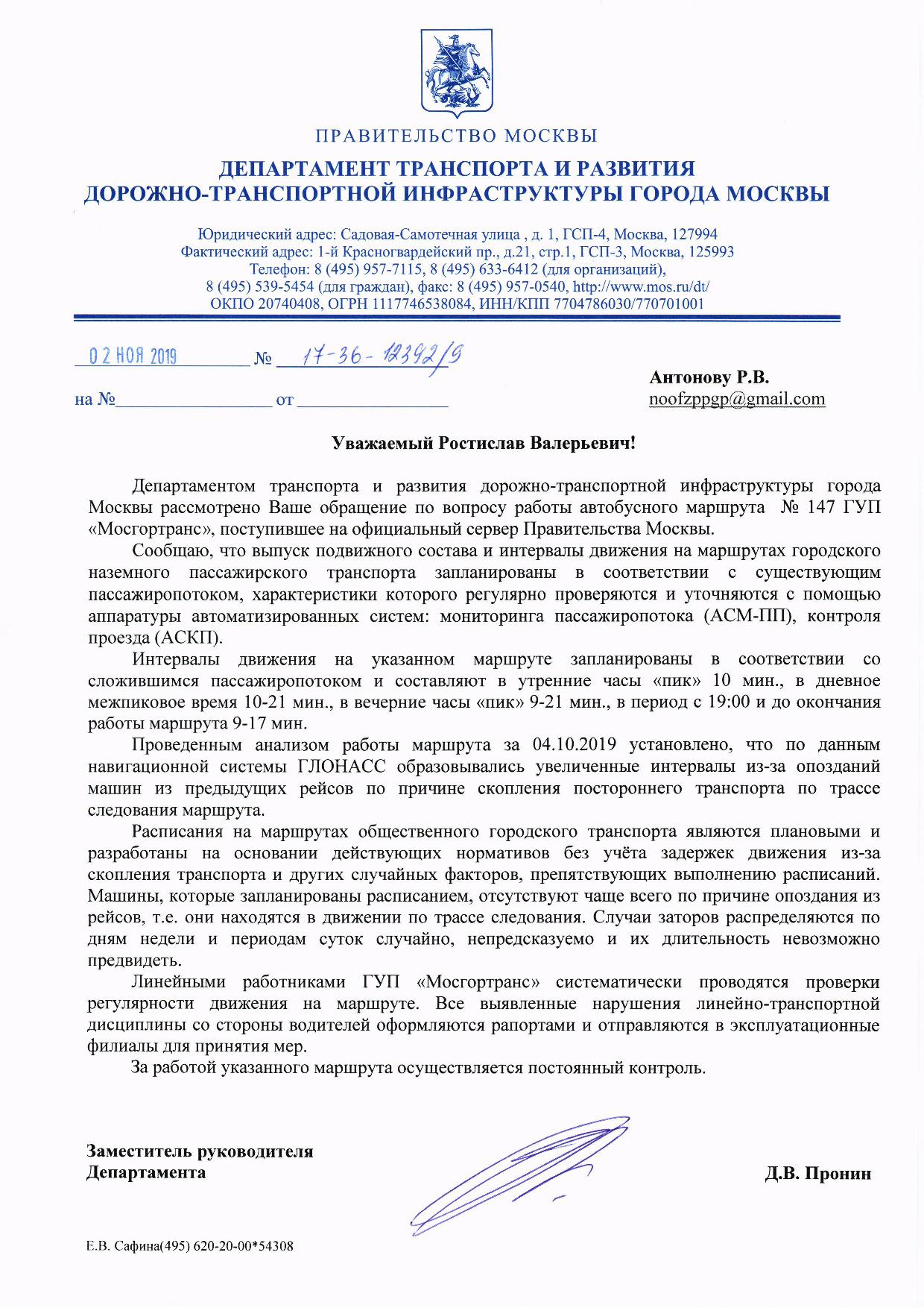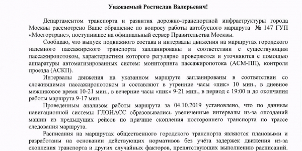 Номер жалобы:60861 Тип жалобы:Общественный транспорт Название объекта: Регион:Москва Город:Москва Адрес:Варшавское шоссе, 85к4 Описание жалобы:Не соблюдаются временные интервалы отправления автобуса 147 от м. Варшавская. Например, 04.10.19 Интервал составил более 25 минут, а заявлено 14 минут. Автобус движется по выделенной полосе. Общее состояние на дорогах (пробки) не влияет на его движение. Статус:
