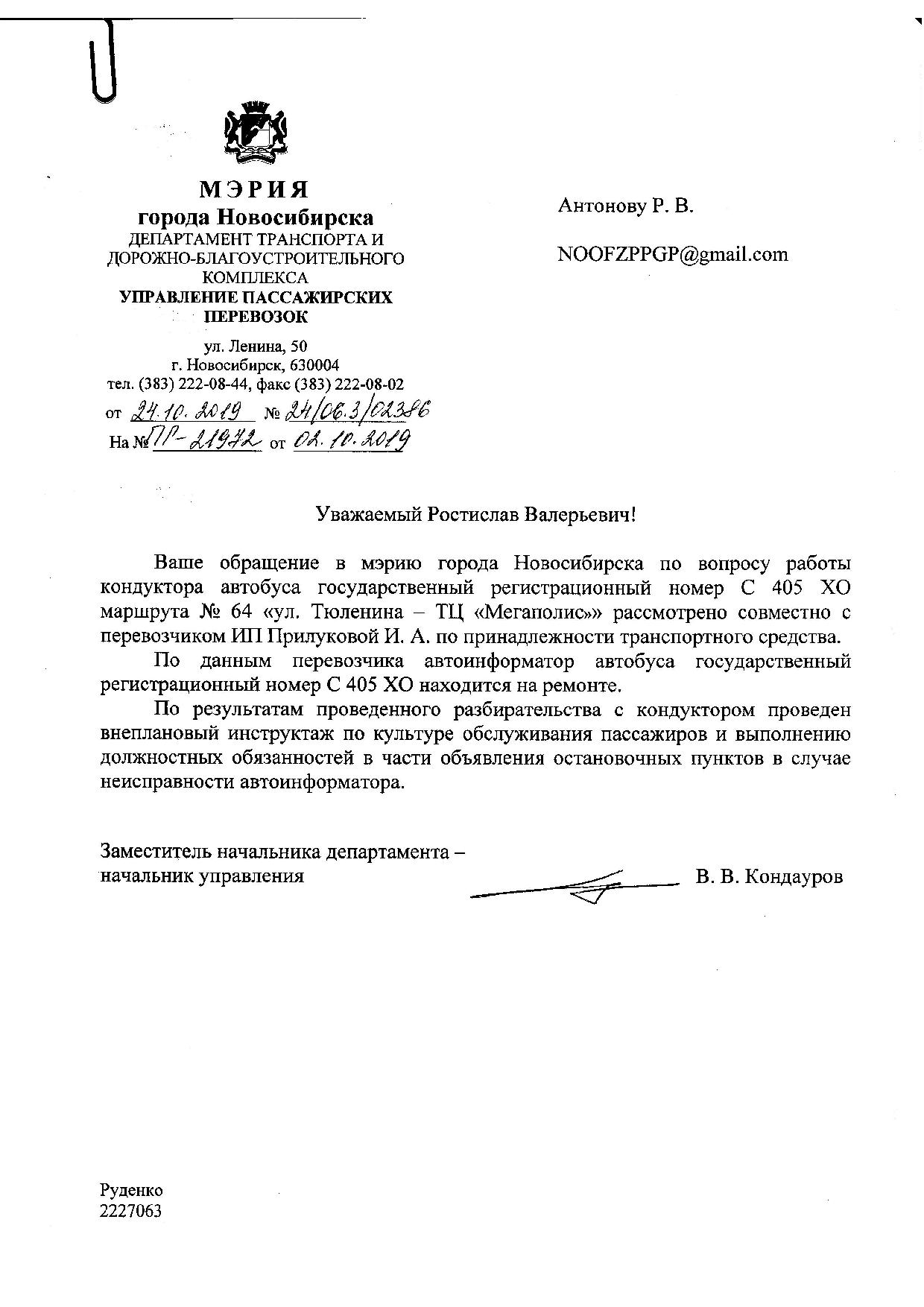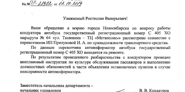 Номер жалобы:60761 Тип жалобы:Общественный транспорт Название объекта: Регион:Новосибирская область Город:Новосибирск Адрес:улица Станиславского, 32 Описание жалобы:Автобус маршрута 64, номер 405. Кондуктор хамит, остановки не объявляет. Автоинформатор не работает. Кондуктору этому уже делали замечания, и писали на него жалобу, но это не повлияло на него. 17:20, 30.09.19. станиславский жм. В сторону автокомбината. Дружки кондуктора, парень с девушкой, лежали вальяжно на сидених, пожилым людям место не уступили, болтали с кондуктором. Статус: