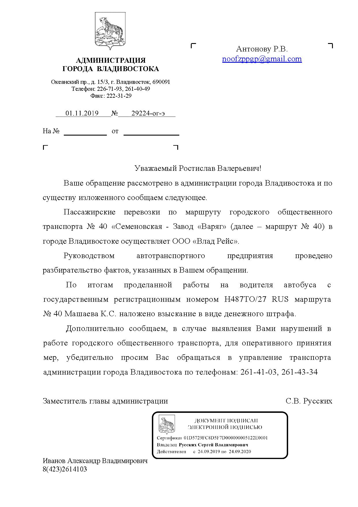 Номер жалобы:60816 Тип жалобы:Общественный транспорт Название объекта: Регион:Приморский край Город:Владивосток Адрес:Алеутская улица Описание жалобы:Водитель автобуса с госномером Н 487 ТО, по маршруту № 40, курил во время движения. На замечание был получен неоднозначный ответ, из которого следовало, что водитель "едет домой и не думал что кто-то сидит в салоне", однако в салоне автобуса в это время находилось 3 пассажира. Время съёмки 18:55, 03.10.2019г Статус: Вложенные файлы: