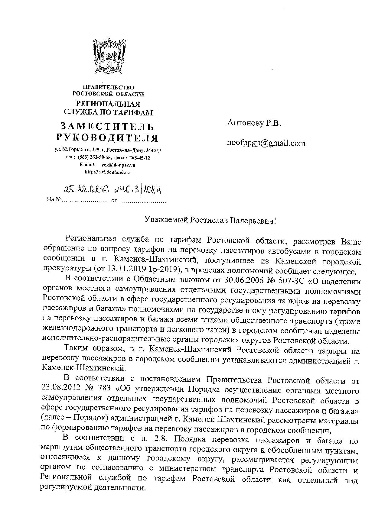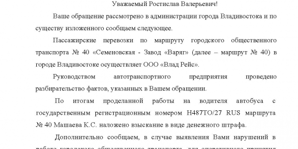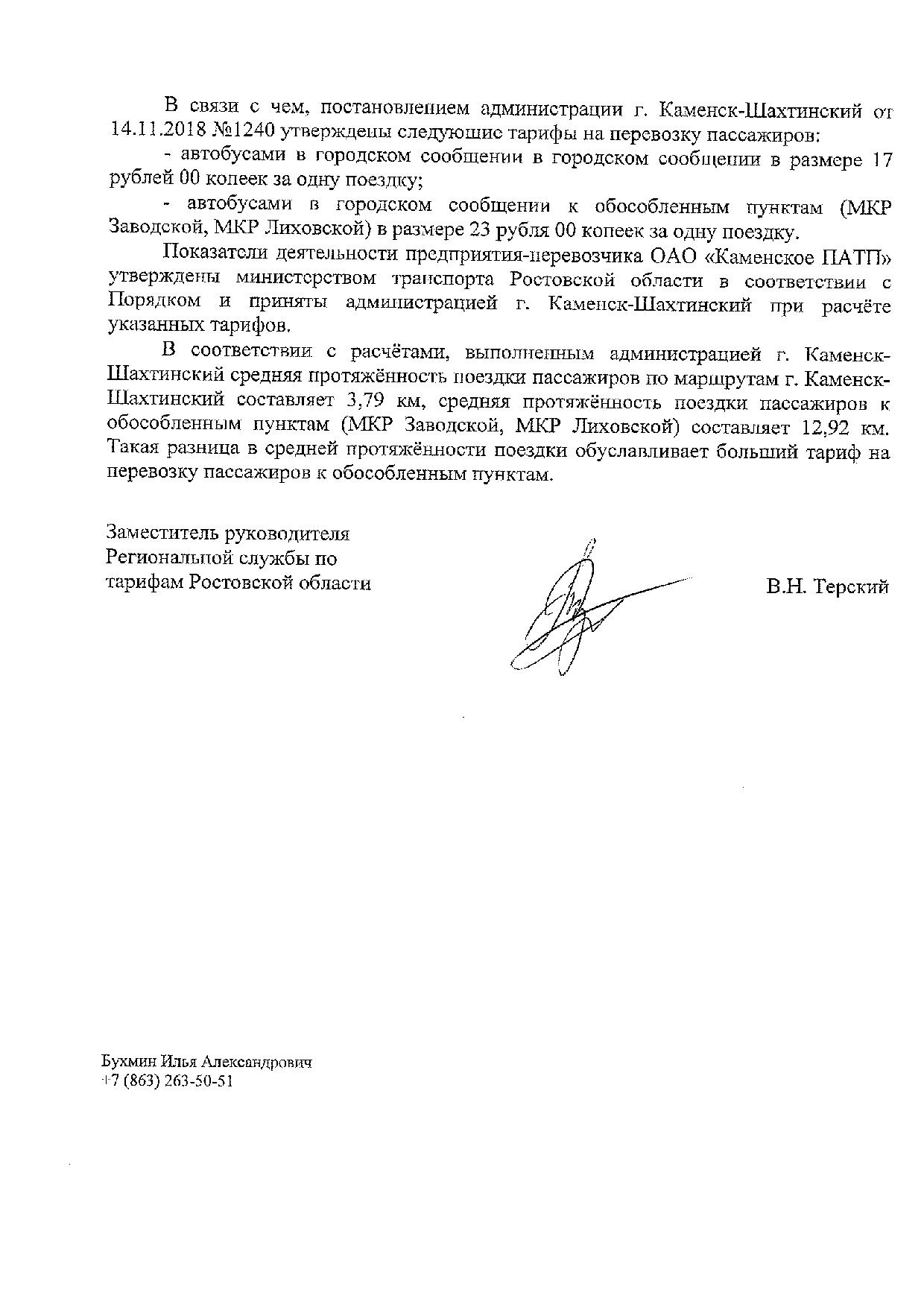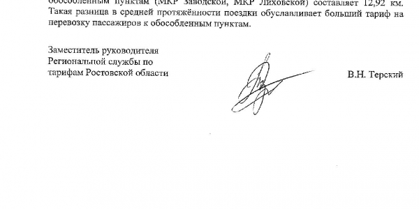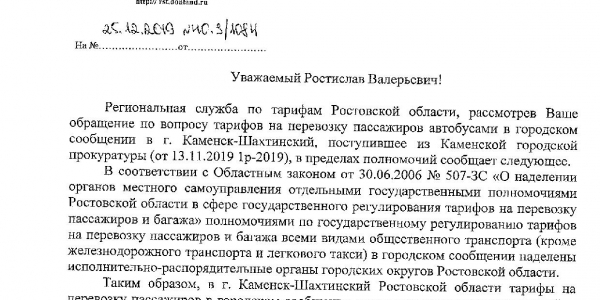 Номер жалобы:60980 Тип жалобы:Общественный транспорт Название объекта: Регион:Ростовская область Город:Каменск-Шахтинский Адрес:переулок Зенитчиков, 17А Описание жалобы:15 ноября 2018 на пост главы Администрации города Каменска-Шахтинского по условиям конкурса был назначен Фетисов К. К. С 16 ноября 2018 на городском автобусом общественном транспорте он поднял стоимость проезда:по городу на 2 руб.. а для микрорайонов города (Лиховской и Машзаводской) на 8 руб. На многочисленные вопросы почему такая разная плата отвечать ни кто не желает. А глава обосновыет это тем что микрорайоны города удалены от города, но на протяжении десятилетия стоимость на городском автобусом общественном транспорте была равна и увеличивалась равнозначно с 8руб до с 10руб.до 15 руб. что для жителей города, что для жителей микрорайонов т. к. мы все жители одного города Каменск-Шахтинский. Теперь на трех автобусах городского автобусного общественного транспорта (маршруты 5;25;115)действет два тарифа 17 руб. если этим автобусом едишь по городу и 23 руб. если из города в микрорайон,микрорайон-город.Что вызывает недоумение т. к. не ясно как ведётся учёт по поступлению оплаты, как делят денежные средства поступившие за проезд.Кто-то из пассажиров сел на автовокзале города доехал до жд вокзала, оплатил 17 руб., а кто-то сел в центре микрорайона доехал до автовокзала и оплатил 23 руб. Прошу помочь разобраться т. к. официальные лица отмалчиваются как такое возможно и не дают комментариев каким законом данный тариф урегулировали.А директор ПАТП вовсе перешёл на личности и высказался что одни жители не обязаны оплачивать потребности других жителей, горожане не должны брать на себя бремя увеличения стоимости проезда дабы уровнять стоимость на поезд. Но ведь мы жителе двух микрорайонов численностью 30 тыс. чел так же имеем в паспорте штамп о прописке где указано г. Каменск-Шахтинский микр. Лиховской либо микр. Машзаводской и налоги, счета ЖКХ уплачиваем согласно шкалы для жителей города. Огромная просьба помочь разобраться в этой щепительной ситуации т. к. автобусный транспорт это практические единственное средство передвижения для посещения медицинских и государственных учреждений, такси обходится 800 руб.,а электропоезда ходят утром в девятом часу в город и в двенадцатом часу дня из города, что не удобно для тех кто посещает медицинские и государственные учреждения. Статус: