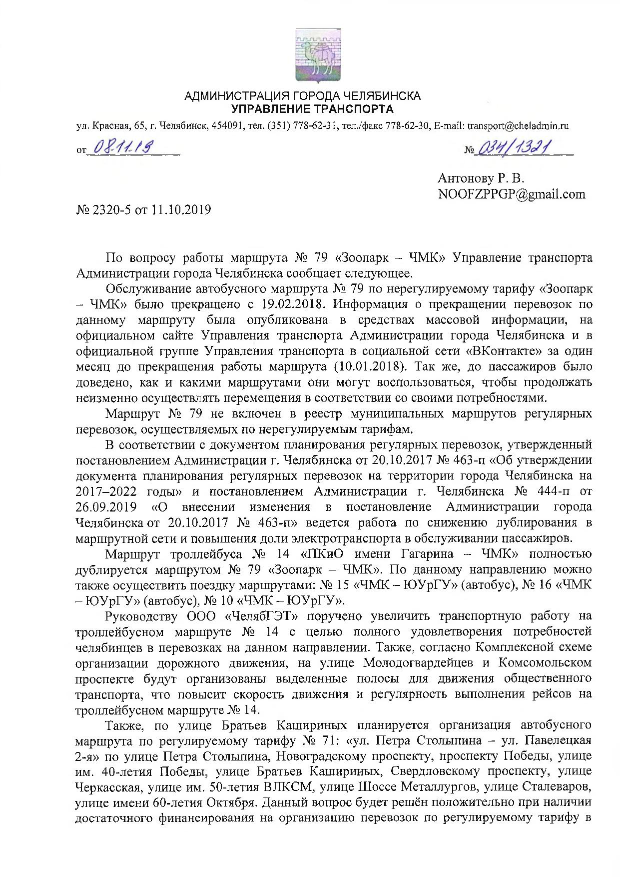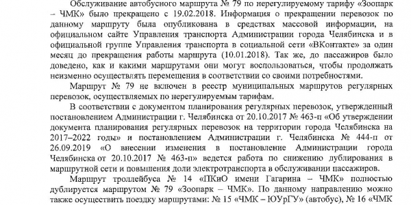 Номер жалобы:61034 Тип жалобы:Общественный транспорт Название объекта: Регион:Челябинская область Город:Челябинск Адрес:улица Богдана Хмельницкого Описание жалобы:Требую вернуть 79 маршрутное такси. После отмены невозможно уехать с чмз на северо-запад. Остался единственный транспорт 24 маршрутка, но она не справляется с объёмом, раньше на одну 24 приходилось две 79,теперь все садятся в одну! Или возвращайте 79 или пускайте полноценный автобус! Статус: