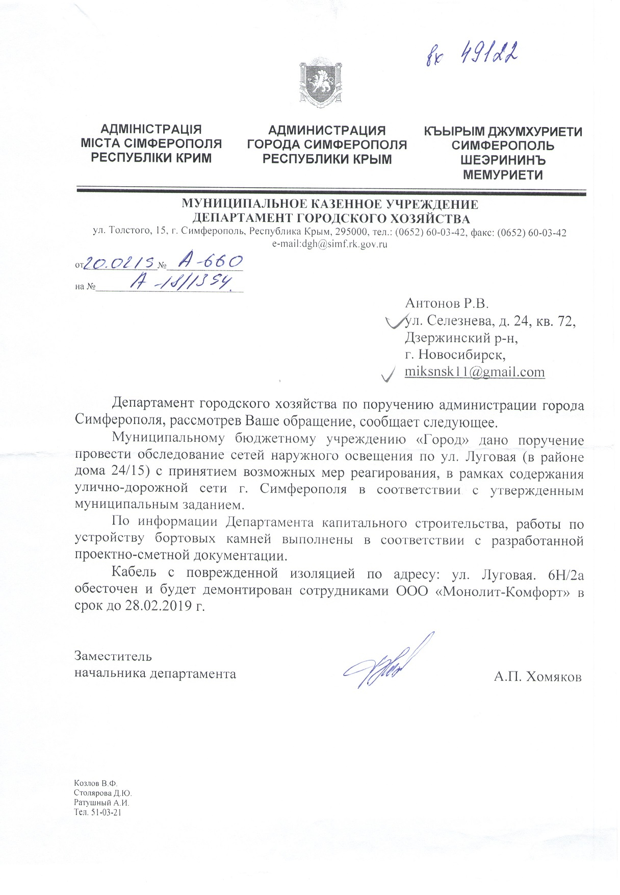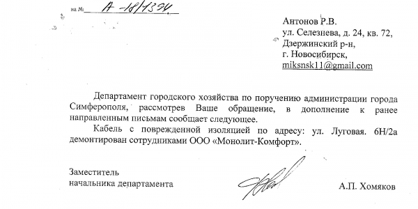 Номер жалобы:49122 Тип жалобы:Иные проблемы ЖКХ Название объекта: Регион:Республика Крым Город:Симферополь Адрес:Луговая улица, 6Н/2Ак1 Описание жалобы:Кабель с поврежденной изоляцией проложен по газону к подстанции, вдоль жилого дома, лежит с декабря 2018, рядом детская площадка. Минэнерго Респ. Крым.