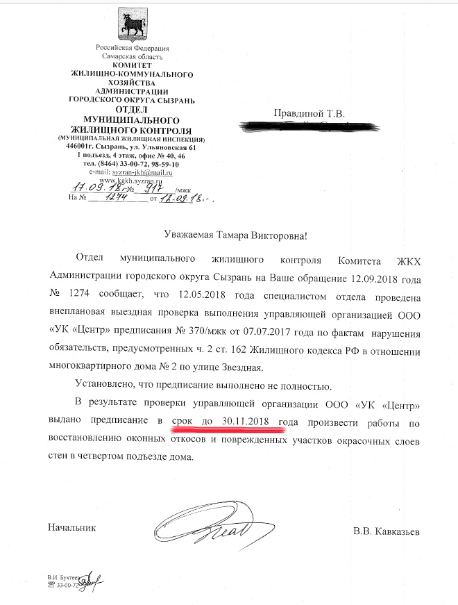 Номер жалобы:49138 Тип жалобы:Иные проблемы ЖКХ Название объекта: Город:Сызрань Адрес:Звездная,2 Описание жалобы:В марте 2017г. в подъезде моего дома (Сызрань,Звездная 2 , подъезд 4 )был выполнен сначала ремонт УК " Центр", а летом 2017 года были заменены окна. Горе-специалисты УК "Центр" поцарапали стены, разбили оконные проемы, напылили в подъезде и ушли. На жалобу жильцов в комитет жилищно-коммунального хозяйства Администрации г.о.Сызрань пришел ответ: УК "Центр" выдано предписание устранить недостатки в срок до 14.08.2017года. Поскольку предписание не было выполнено, жильцы вновь обратились в комитет жилищно-коммунального хозяйства Администрации г.о.Сызрань и получили новый ответ :УК "Центр" выдано предписание устранить недостатки в срок до 30.11.2018г.