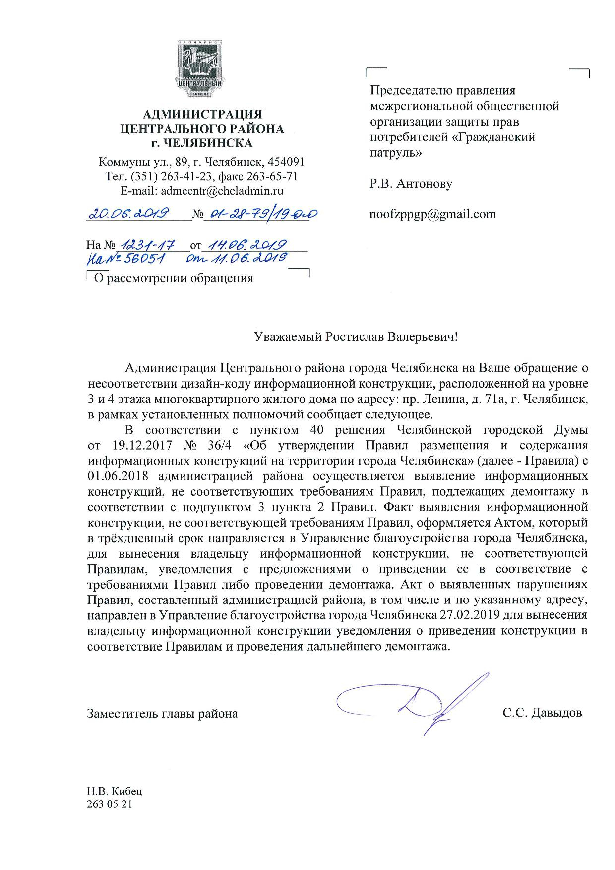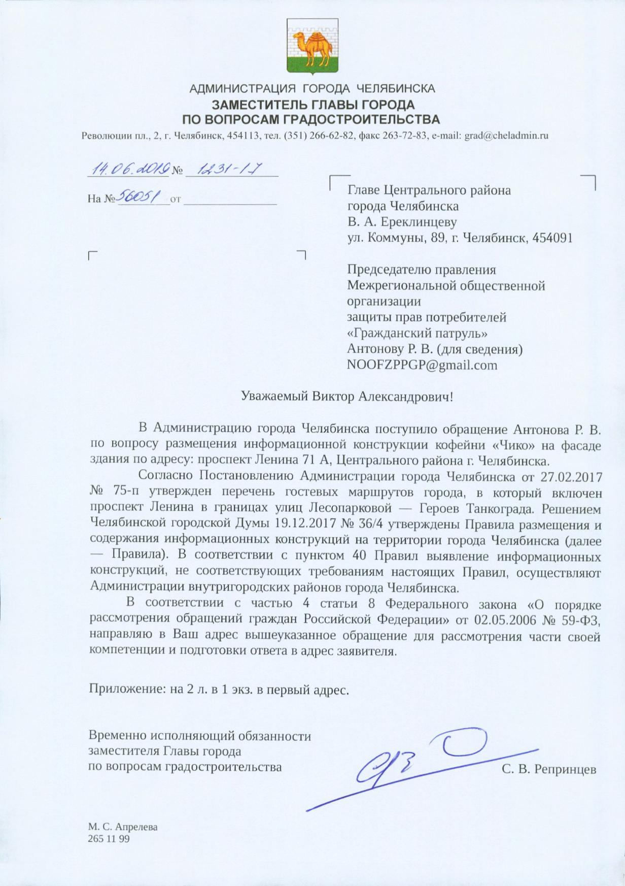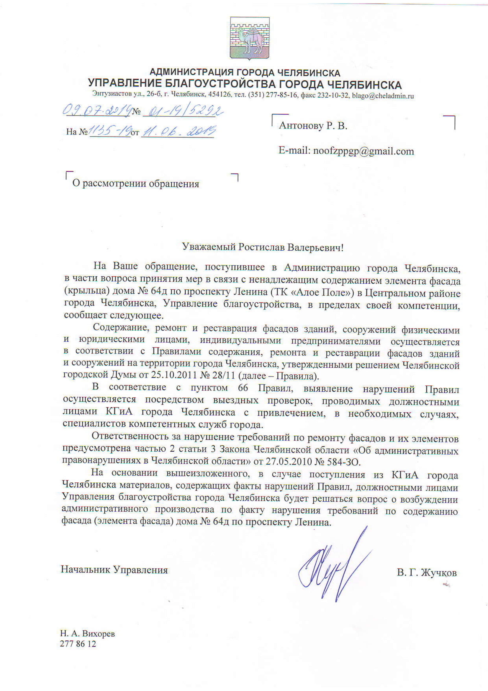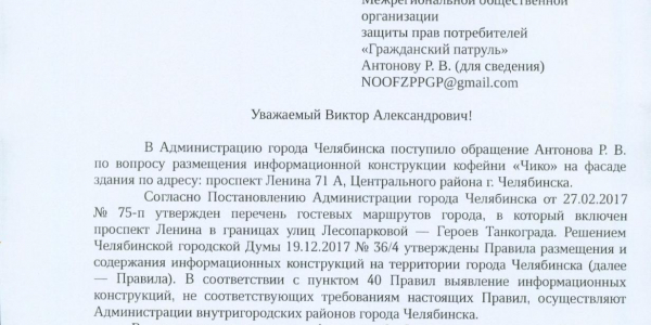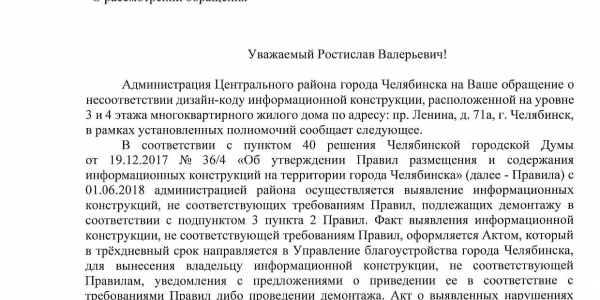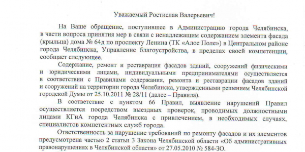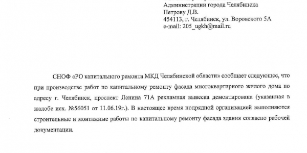 Номер жалобы:56051 Тип жалобы:Прочее Название объекта: Регион:Челябинская область Город:Челябинск Адрес:проспект Ленина, 71А Описание жалобы:1231-17 Сейчас идёт капитальный ремонт фасада здания по адресу пр-т Ленина, 71А, при этом на углу здания висит рекламная конструкция, мешающая проведению качественного ремонта. Конструкция эта не актуальна — кофейни "Чико" уже давно не существует. Необходимо демонтировать эту рекламную конструкцию и провести качественный ремонт фасада здания. Статус: