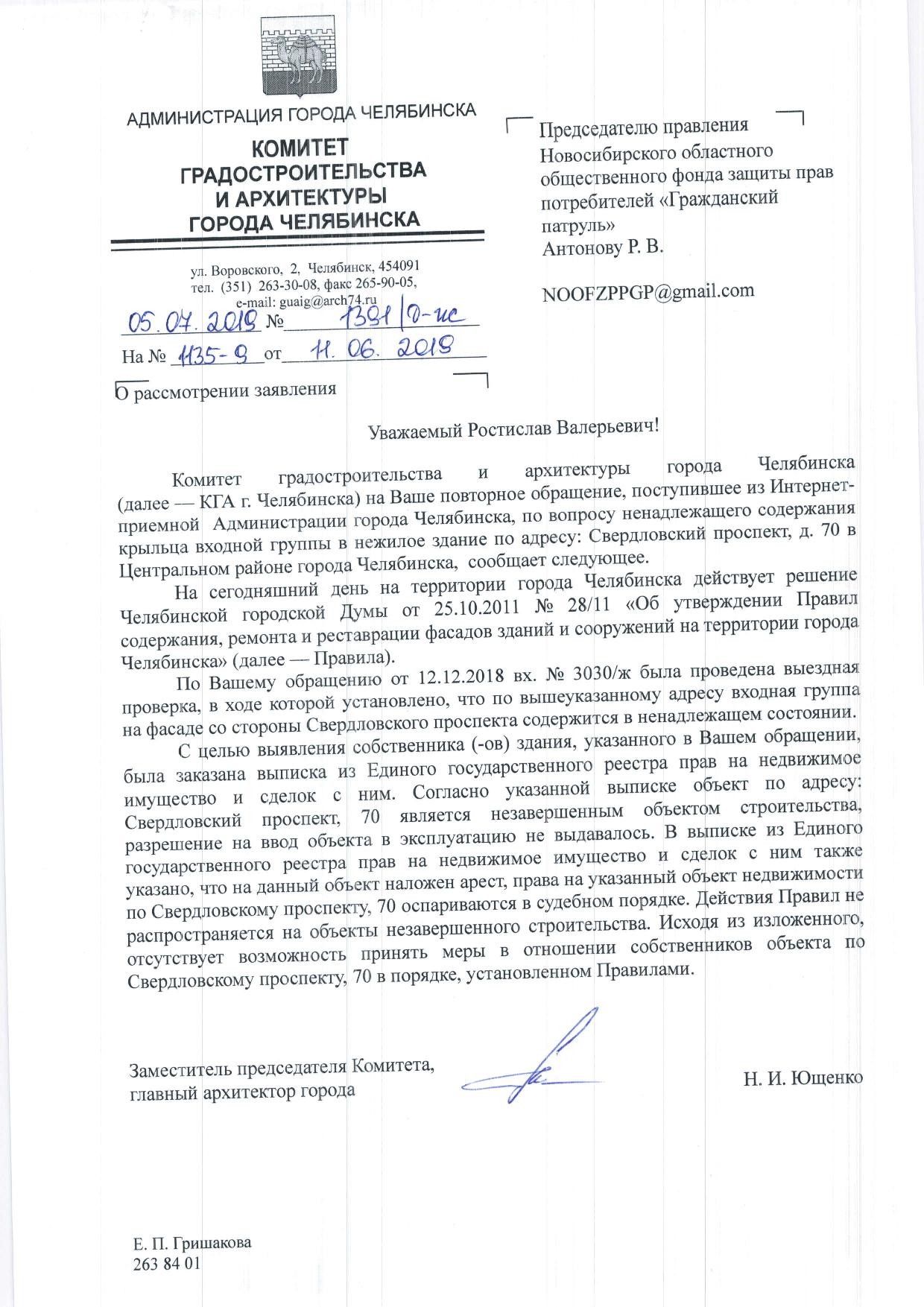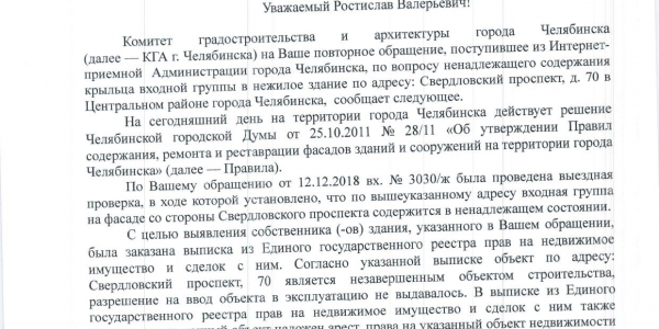 Номер жалобы:56052 Тип жалобы:Прочее Название объекта: Регион:Челябинская область Город:Челябинск Адрес:Свердловский проспект, 70 Описание жалобы:Прошёл год, а ситуация не меняется: собственники/арендаторы не приступают к ремонту крыльца нежилого здания Свердловский пр-т, 70.
