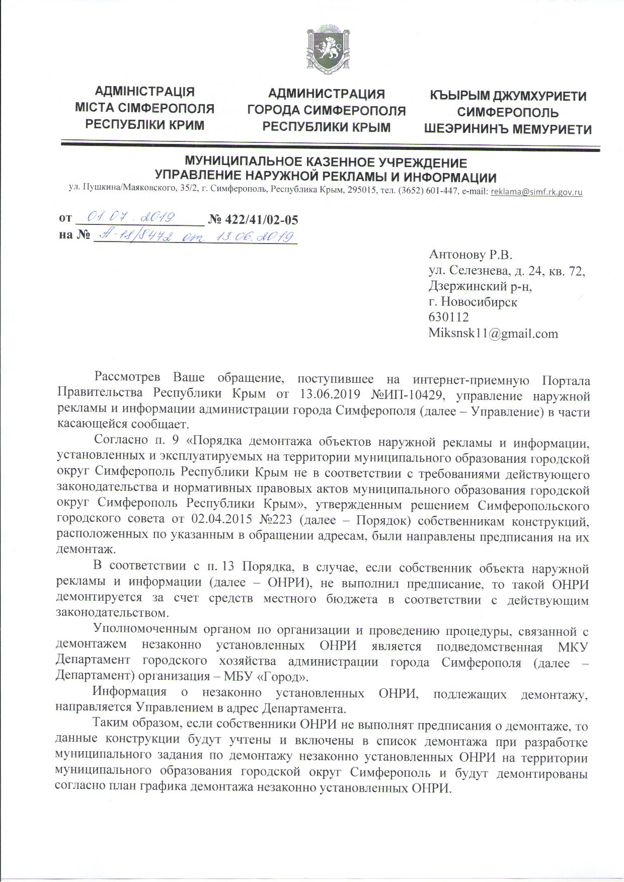 Номер жалобы:56053 Тип жалобы:Прочее Название объекта: Регион:Республика Крым Город:Симферополь Адрес:проспект Победы, 209/1 Описание жалобы:реклама на фасадах, прошу демонтировать Статус:
