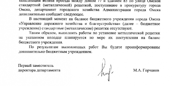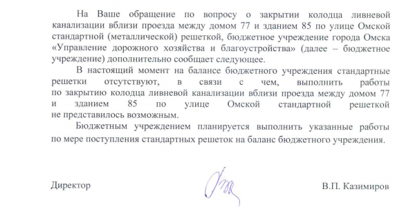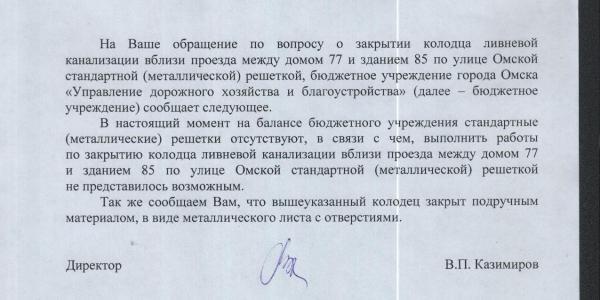 а также по жалобе 54976 тоже в прокуратуру! этот колодец находится прямо у пешеходного перехода, прямо у школы № 65 по адресу Омская, 75. его тоже снимали в репортаже. Но после него лишь только издевательски добавили штакетника на колодец.