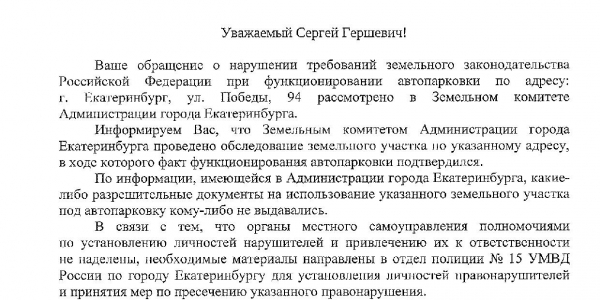 Номер жалобы:56049 Тип жалобы:Прочее Название объекта: Регион:Свердловская область Город:Екатеринбург Адрес:улица Победы, 94 Описание жалобы:Нелегальная автостоянка во дворе домов Победы 94, Бакинских комиссаров 58 Статус: