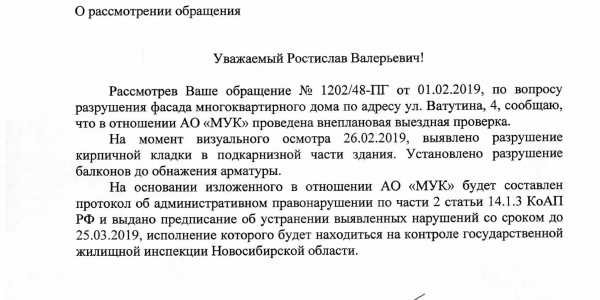 Номер жалобы:48996 Тип жалобы:Иные проблемы ЖКХ Название объекта:Управляющая Компания Город:Новосибирск Адрес:Новосибирск, 6 улица Ватутина Описание жалобы:Рушится фасад. Статус: