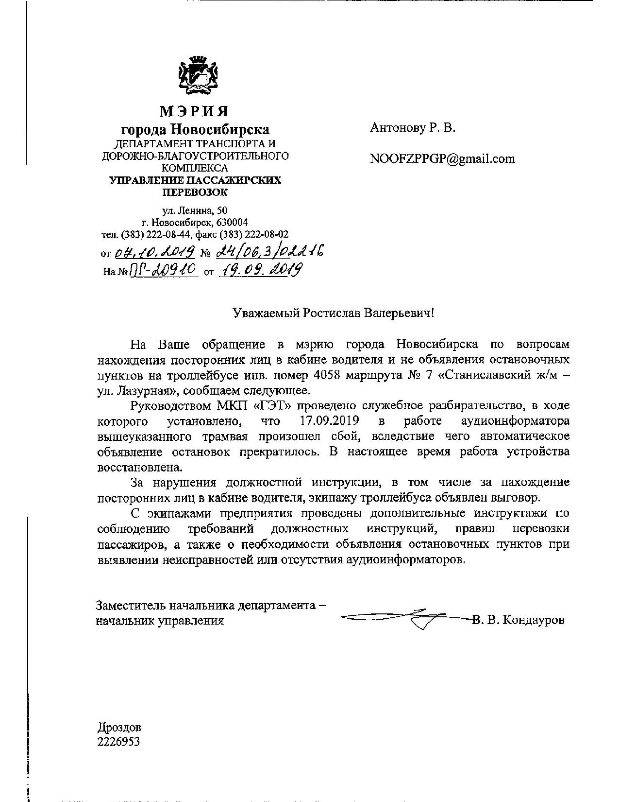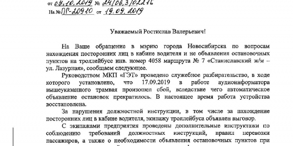 Номер жалобы:60380 Тип жалобы:Общественный транспорт Название объекта: Регион:Новосибирская область Город:Новосибирск Адрес:Новосибирск, улица Титова, 23 Описание жалобы:Посторонние в кабине водителя, отвлекают от управления. Автоинформатор не работает, кондуктор не объявляет остановки. Статус: