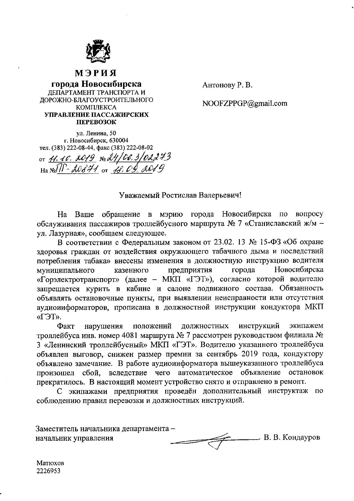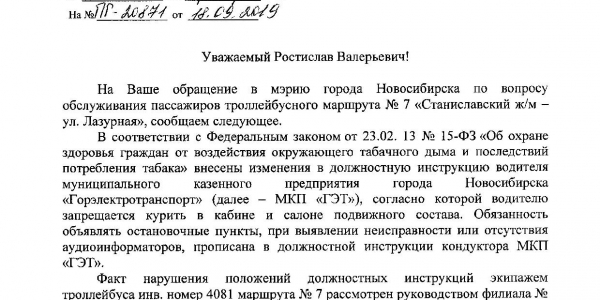Номер жалобы:60384 Тип жалобы:Общественный транспорт Название объекта: Регион:Новосибирская область Город:Новосибирск Адрес:улица Станиславского, 36к1 Описание жалобы:Снова нарушение тем же водителем: курит в троллейбусе во время движения, пассажиров на проезжей части высадил на станиславского, а не на остановке, как положено. Кондуктор остановки не объявляет, автоинформатор не. Статус: