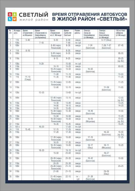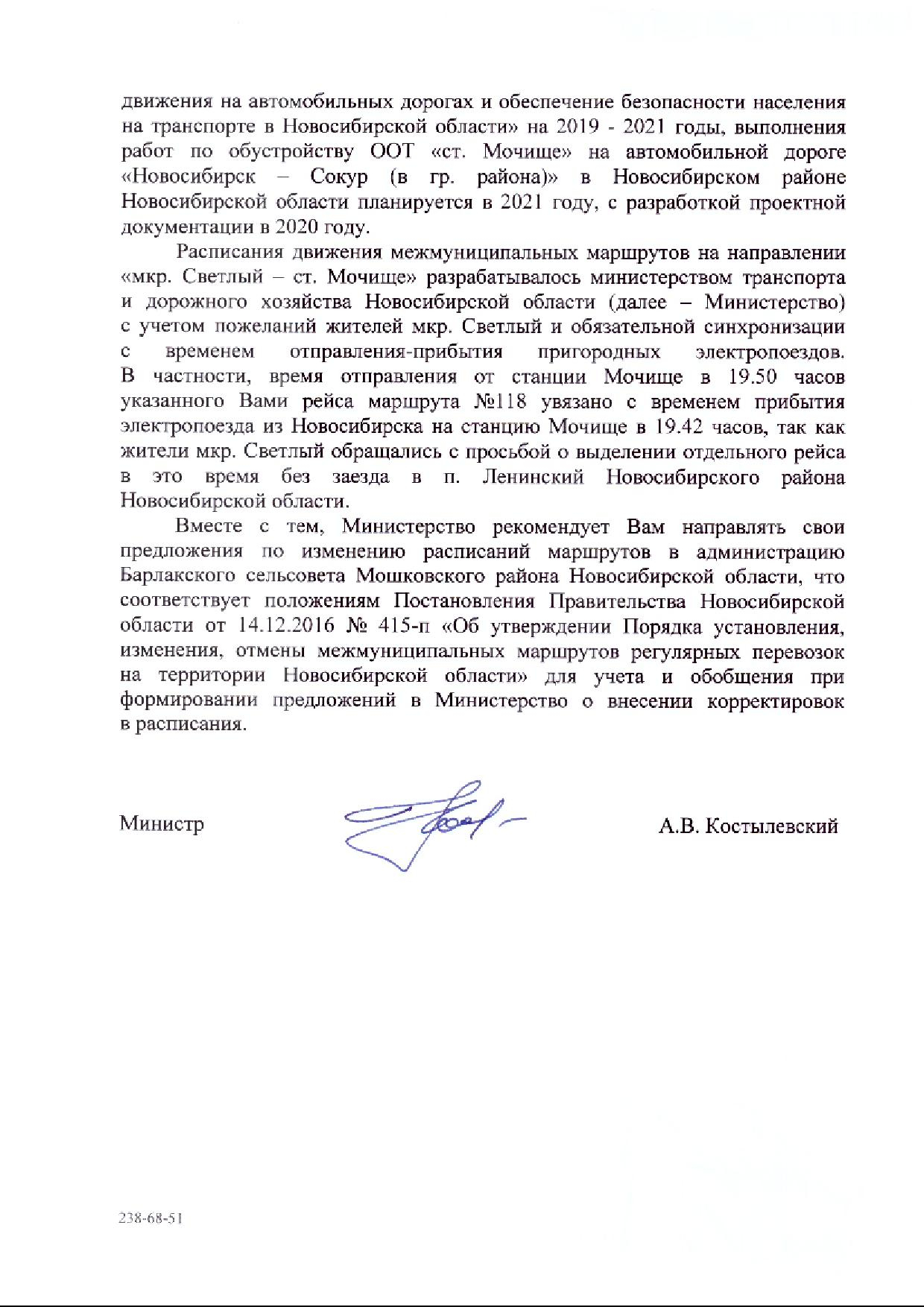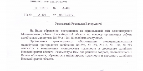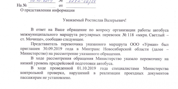 Номер жалобы:60665 Тип жалобы:Общественный транспорт Название объекта: Регион:Новосибирская область Город:посёлок Октябрьский Адрес:микрорайон Светлый Описание жалобы:Добрый день! Очень хочется поделиться тем, на сколько у нас в районе "оптимальное" расписание общественного транспорта! Автобус из Мочище в Светлый уходит в 18-35 (189 через п. Ленинский), а следующий только в 19-50 (118)!!! А уже за ним, в 20-00 идёт 189 через п. Ленинский в Светлый! Жители не понимают, зачем два автобуса ходят друг за другом, а между ними 1,5 часа перерыв!!! И это не единственный такой перерыв! И не единственный рейс, когда два маршрута друг друга дублируют!!!!Остановки в Мочище нет, она отсутствует!! Ни лавочек, ни навеса! Сидеть на камне непозволительно!!! Взрослые и дети вынуждены столько времени стоять и мёрзнуть, мокнуть на ветру.