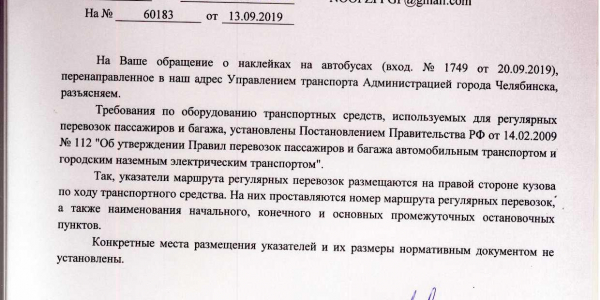 Номер жалобы:60183 Тип жалобы:Общественный транспорт Название объекта: Регион:Челябинская область Город:Челябинск Адрес:улица Дегтярёва Описание жалобы:2162-5 На автобусах ПАЗ на маршруте 35(маршрутка) на окнах наклеяны огромные наклейки с информацией о маршруте. Пассажирам от этого не комфортно, в окно ничего не видно. Требуется очистить все окна маршруток в городе. Окна должны быть чистыми и даже без тоннировки. Администрация и ГИБДД, примите меры Статус: