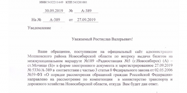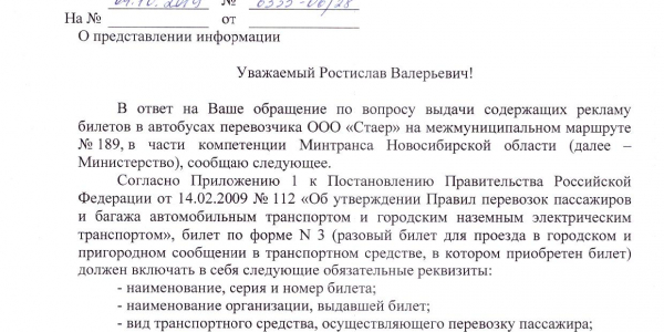 Номер жалобы:60617 Тип жалобы:Общественный транспорт Название объекта: Регион:Новосибирская область Город:посёлок Октябрьский Адрес:микрорайон Светлый Описание жалобы:На маршруте 189 (Новосибирск- Мочище- Светлый) выдаются рекламные билеты на которых отсутствует номер билета. Пассажиры очень обеспокоены, являются ли они страховкой во время поездки. Просим Вас проверить законность таких билетов. Заранее благодарны! Статус: