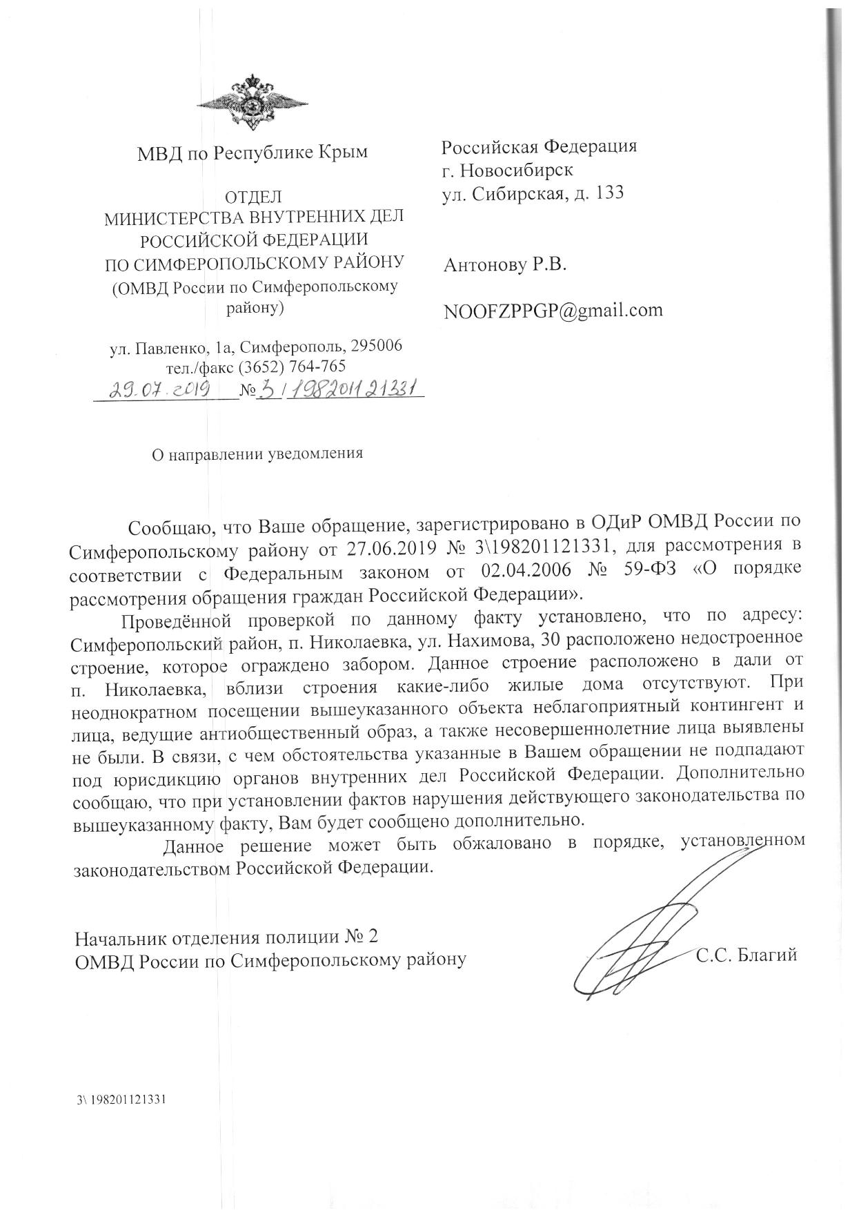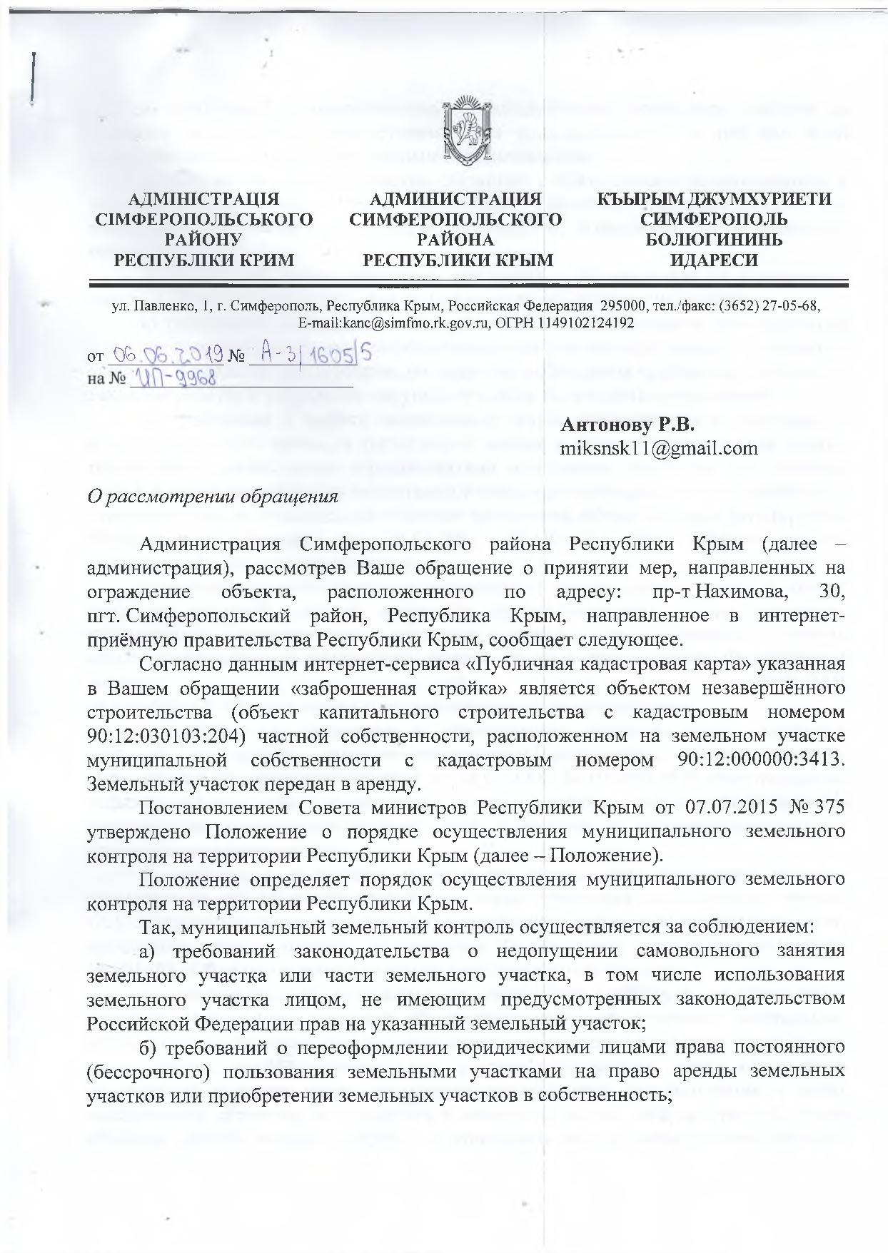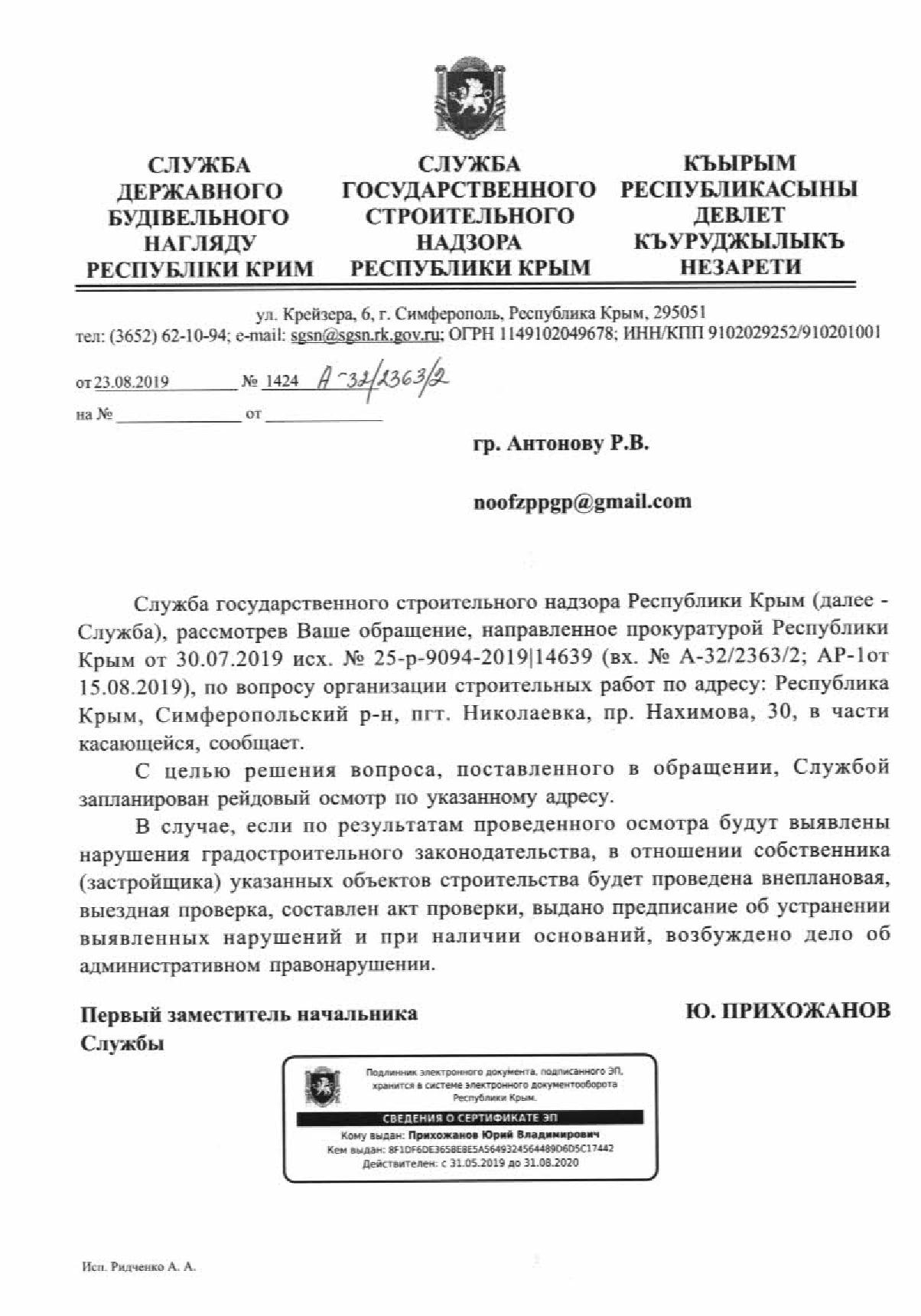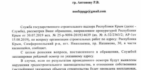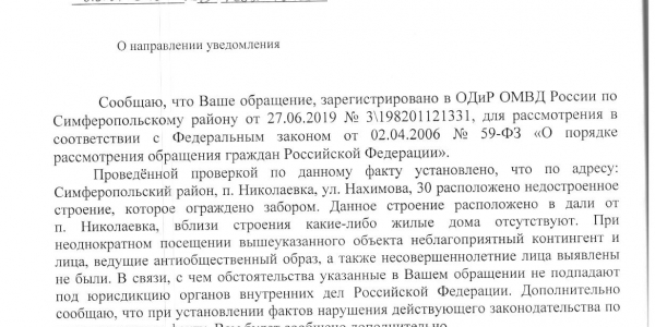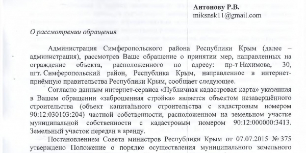 Номер жалобы:55358 Тип жалобы:Прочее Название объекта: Регион:Республика Крым Город:поселок городского типа Николаевка Адрес:проспект Нахимова, 30 Описание жалобы:заброшенная стройка, неогорожена. незаконсервирована прошу выдать собственнику предписание на демонтаж