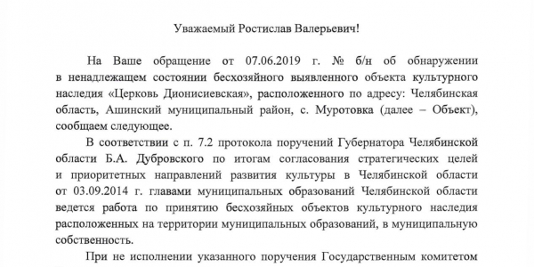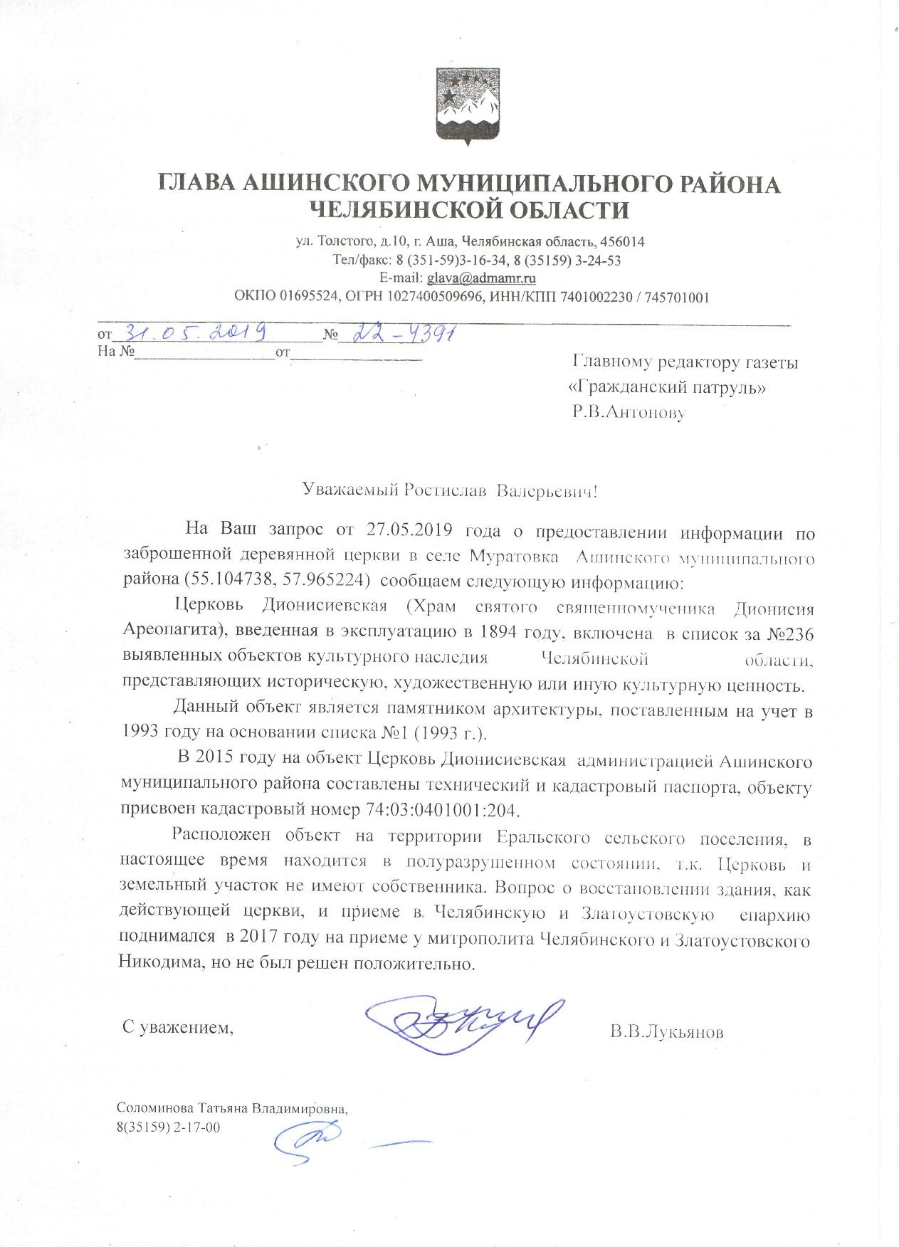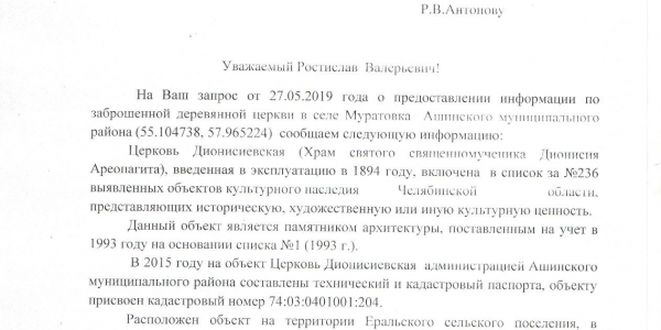 Номер жалобы:55363 Тип жалобы:Прочее Название объекта: Регион:Челябинская область Город:село Муратовка Адрес:(55.109688, 57.966159) Описание жалобы:Запрос от СМИ Деревянная церковь в селе Муратовка (Ашинский р-н), основана во 2-й половине 18 в.