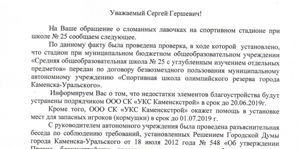 Номер жалобы:55336 Тип жалобы:Прочее Название объекта: Регион:Свердловская область Город:Каменск-Уральский Адрес:41-й квартал Описание жалобы:Сломаны лавочки и трибуны на стадионе СОШ 25 Статус: