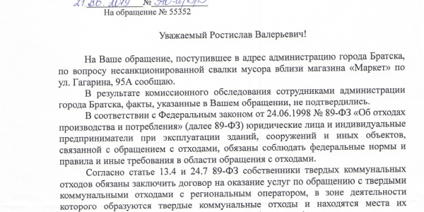 Номер жалобы:55352 Тип жалобы:Прочее Название объекта: Регион:Иркутская область Город:Братск Адрес:улица Гагарина, 95А Описание жалобы:Складирование около магазина легкогорючего мусора Статус: