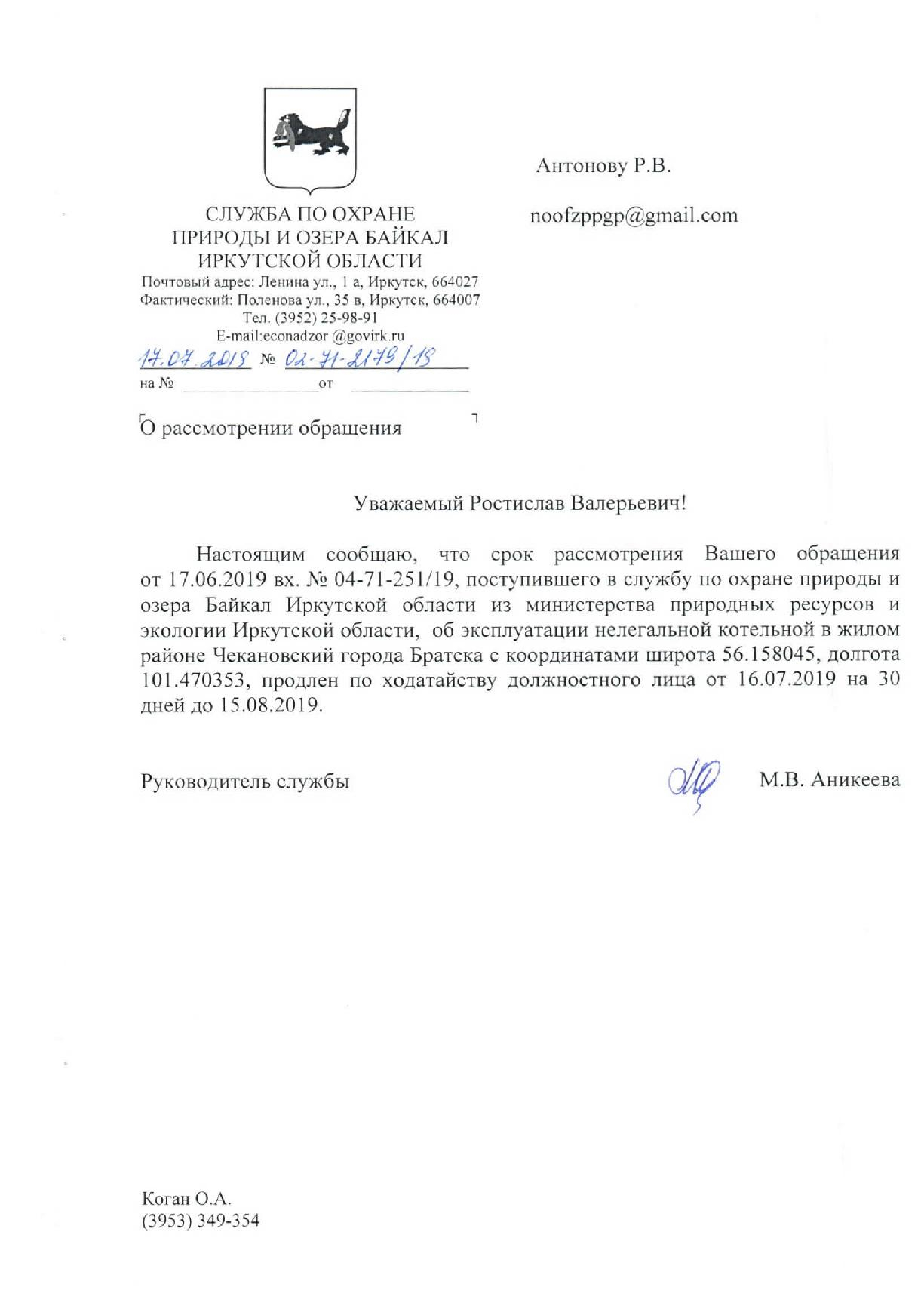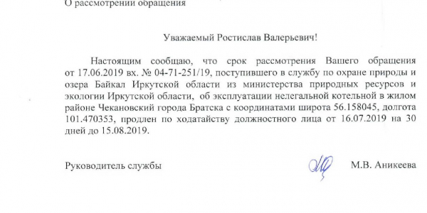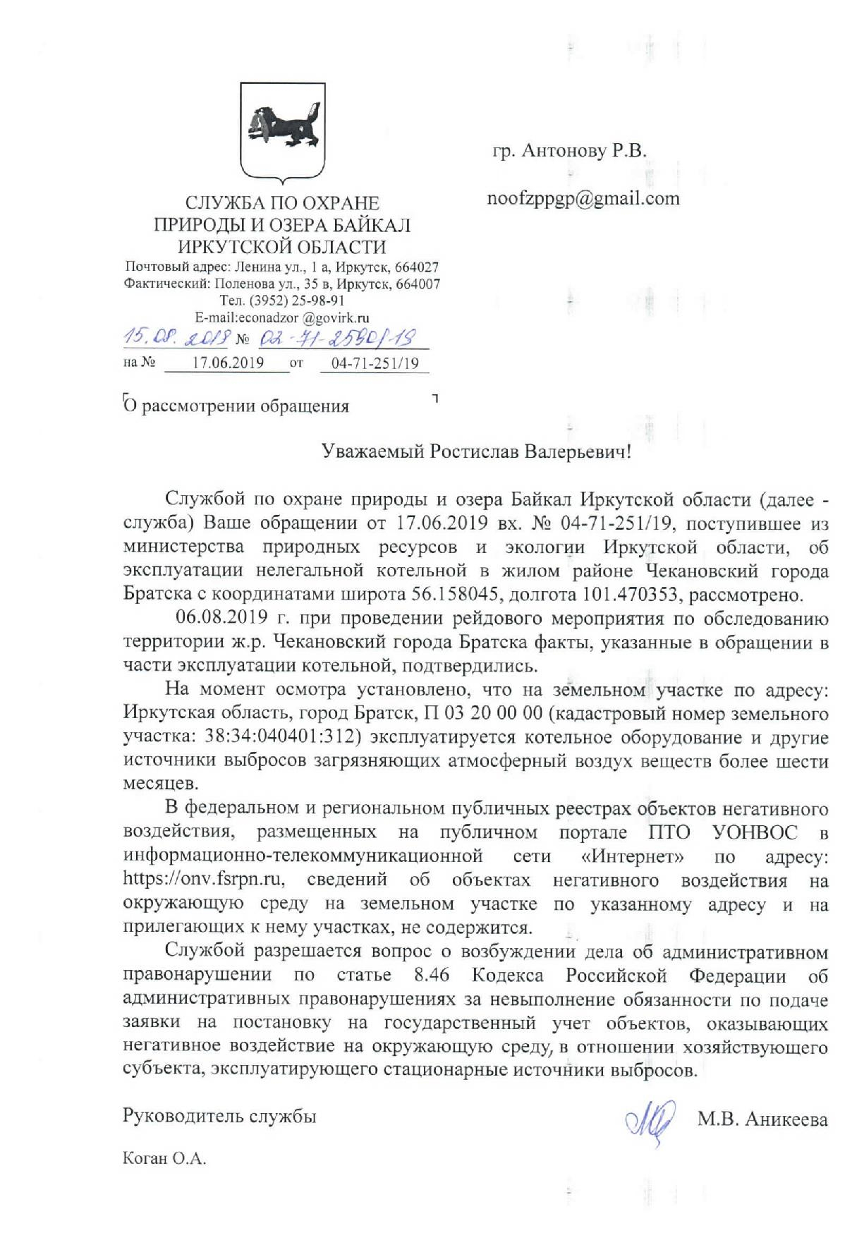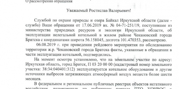 Номер жалобы:55138 Тип жалобы:Прочее Название объекта: Регион:Иркутская область Город:Братск Адрес:жилой район Чекановский Описание жалобы:Экология. Котельная установлена с низкой трубой из за чего дым стелится по земле ухудшая экологическую обстановку. Возможно незарегистрированный источник загрязнения воздуха. Статус: