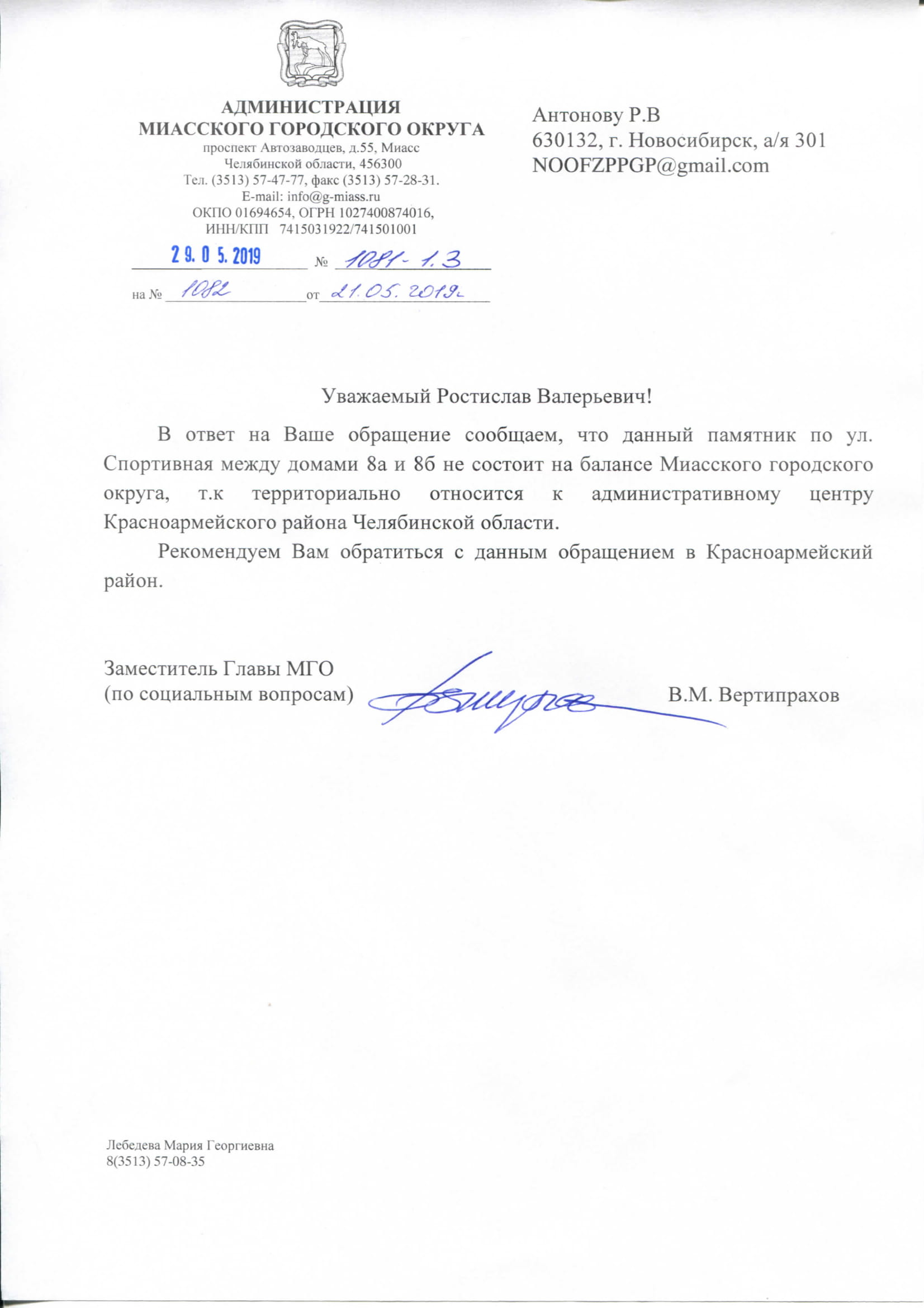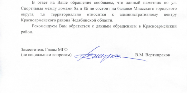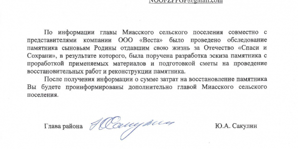 Номер жалобы:55167 Тип жалобы:Прочее Название объекта: Регион:Челябинская область Город:село Миасское Адрес:Спортивная улица, 8Б Описание жалобы:Необходим ремонт памятника. Он в ужасном состоянии. Находится между домами 8а и 8б ул Спортивной. Статус: