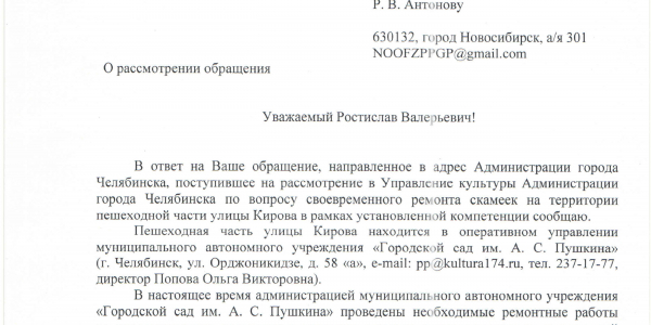Номер жалобы:55168 Тип жалобы:Прочее Название объекта: Регион:Челябинская область Город:Челябинск Адрес:улица Кирова Описание жалобы:На Кировке необходимо менять доски на скамейках во время. Имеющиеся, подвержены гнили и ничем не обработаны. Вид ужасный. Статус: