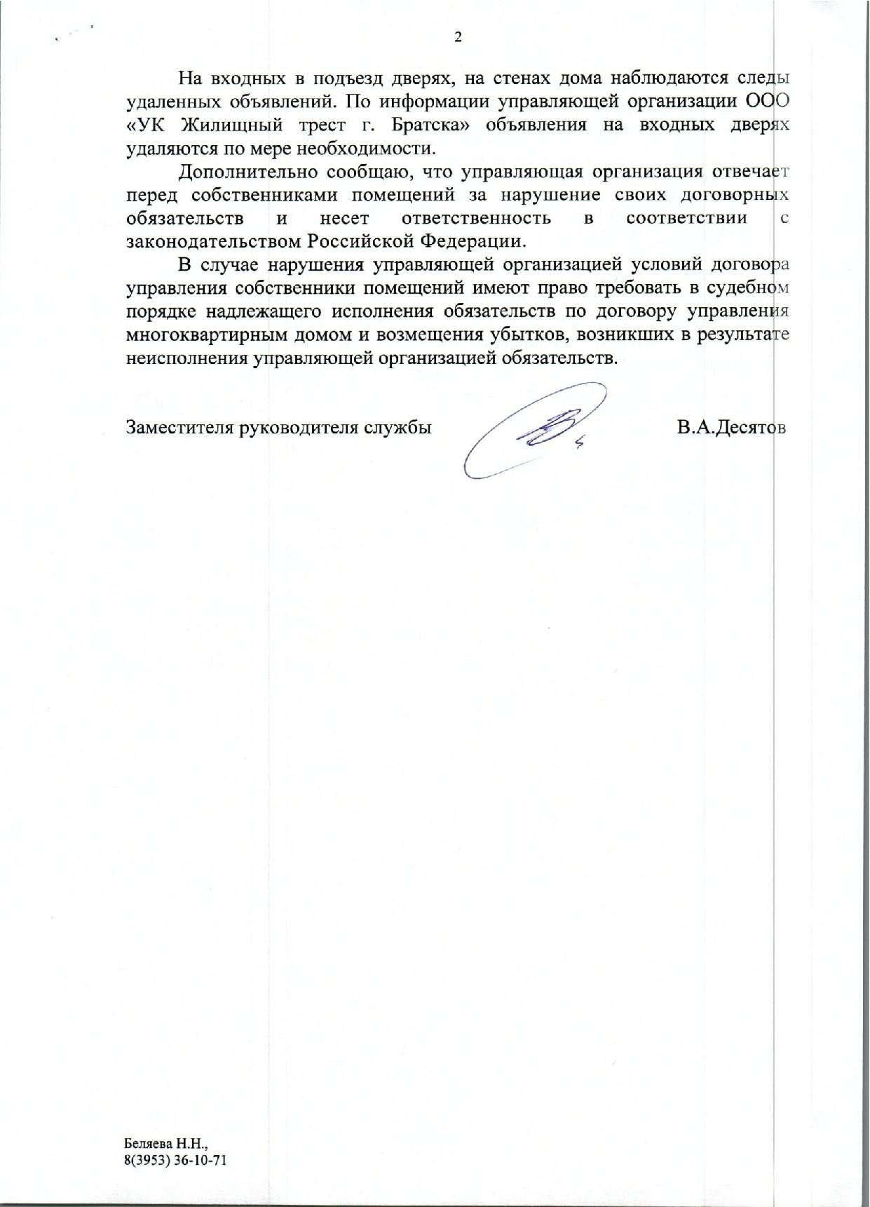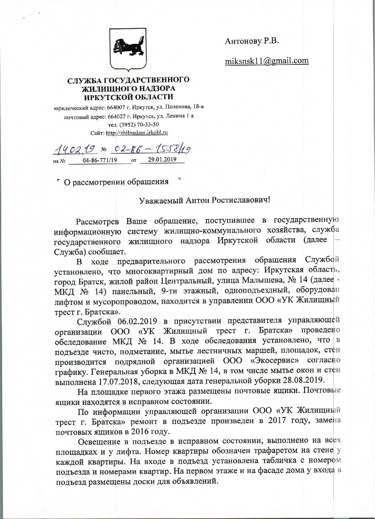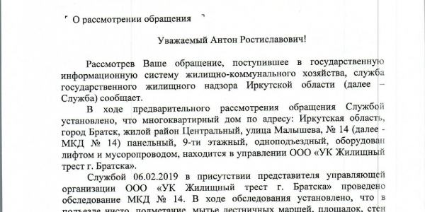 Номер жалобы:48656 Тип жалобы:Иные проблемы ЖКХ Название объекта: Регион:Иркутская область Город:Братск Адрес:улица Малышева, 14/33 Описание жалобы:В городе Братск по адресу Малышева 14/33 , жкх не смотрит за домом. Плохо убираются в подъезде ( грязные стены , стекла, торчат провода). Нет вывески на двери подъезда ( номера подъезда и номера квартир). Нет почтовый ящиков, что крайне ну удобно ( не приносят не оповещений , не писем с почты !).Нет полноценного освещения на лестничной клетке. Статус: