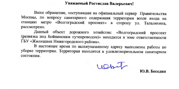 Номер жалобы:48698 Тип жалобы:Иные проблемы ЖКХ Название объекта: Регион:Москва Город:Москва Адрес:Волгоградский проспект, 26с1 Описание жалобы:Не убирается мусор у метро Волглоград.проспект д.стр.5 Статус: