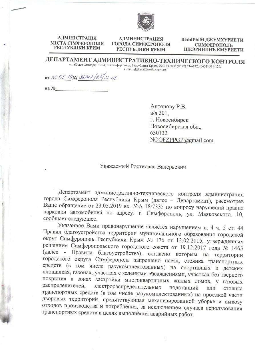 Номер жалобы:54878 Тип жалобы:Прочее Название объекта: Регион:Республика Крым Город:Симферополь Адрес:улица Маяковского, 10 Описание жалобы:парковка на газоне Статус: