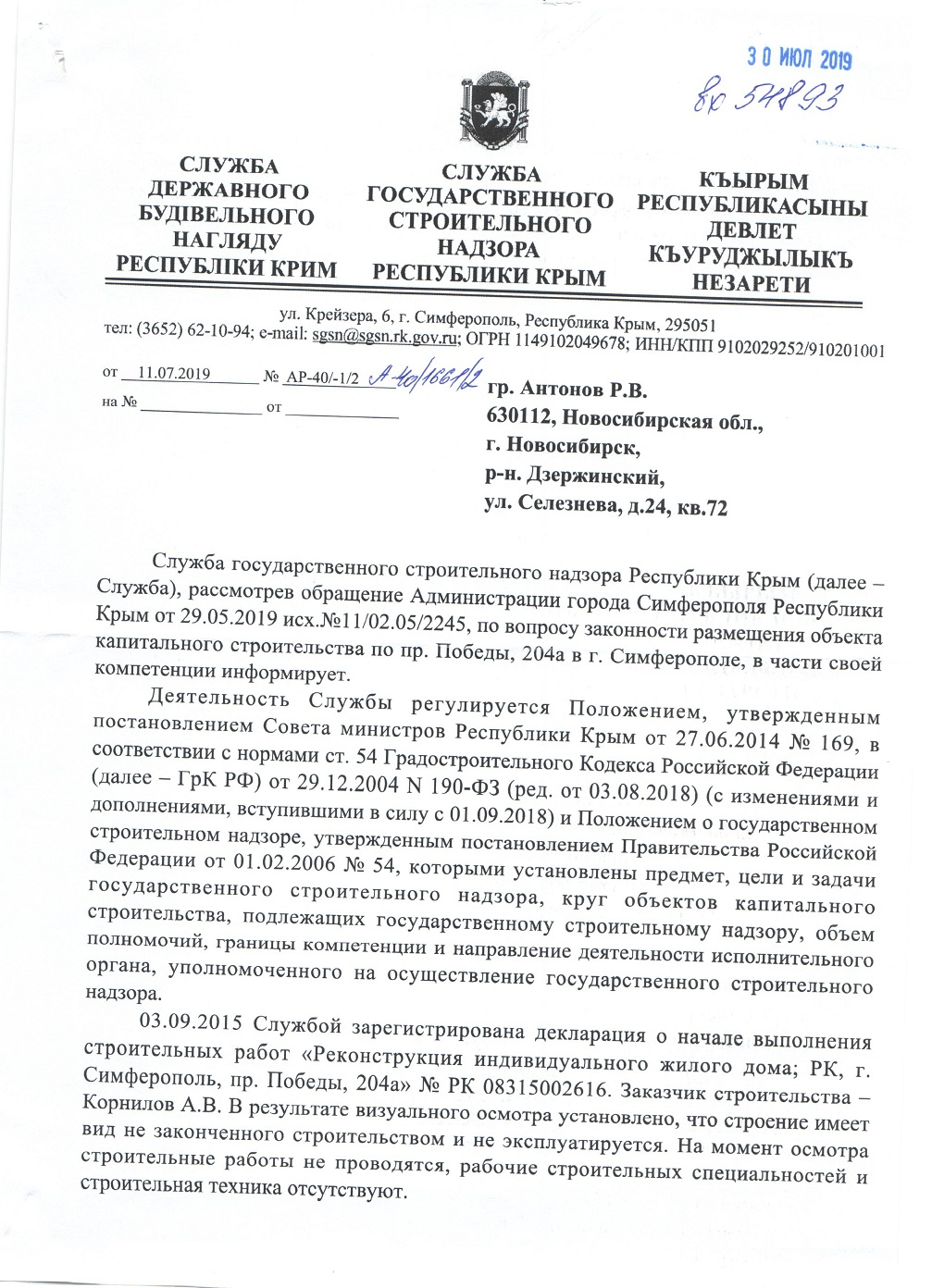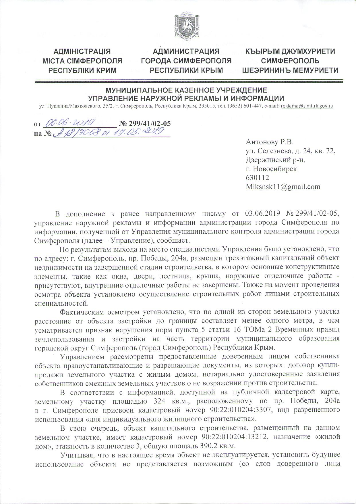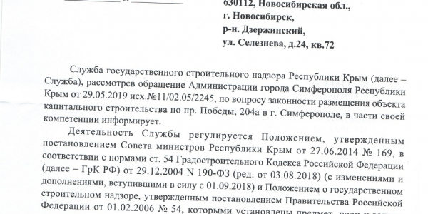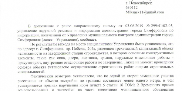Номер жалобы:54893 Тип жалобы:Прочее Название объекта: Регион:Республика Крым Город:Симферополь Адрес:проспект Победы, 204 Описание жалобы:самострой, на землях ижс- строится торговый/офисный центр, с нарушением пожарных отступов от границ земельного участка Статус: