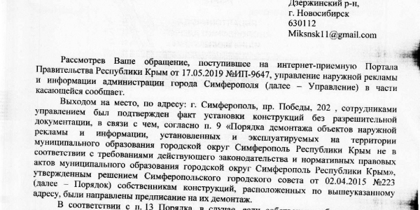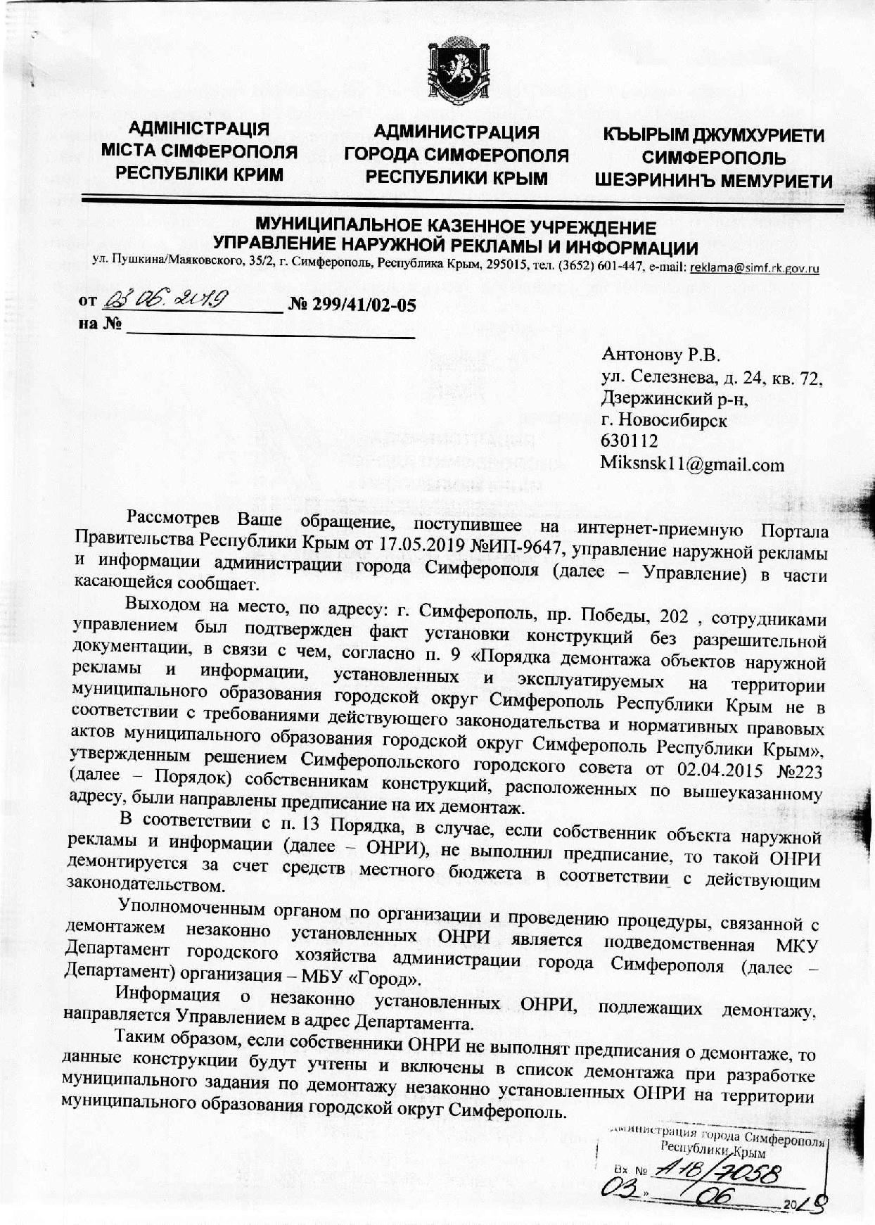Номер жалобы:54892 Тип жалобы:Прочее Название объекта: Регион:Республика Крым Город:Симферополь Адрес:проспект Победы, 202 Описание жалобы:незаконная реклама на фасадах