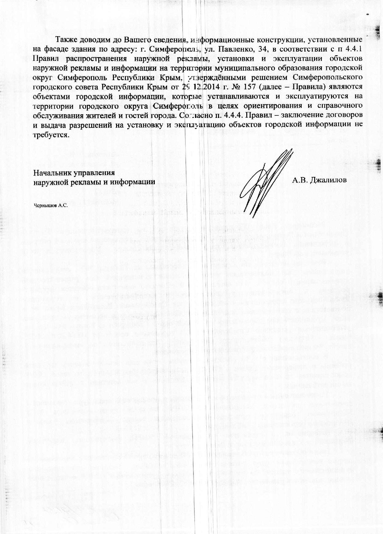 Номер жалобы:54858 Тип жалобы:Прочее Название объекта: Регион:Республика Крым Город:Симферополь Адрес:улица Павленко, 34 Описание жалобы:изменены фасады, кондиционеры, реклама, прошу демонтировать Статус: