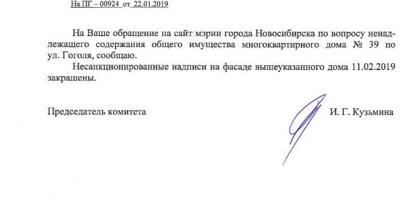 Номер жалобы:48530 Тип жалобы:Иные проблемы ЖКХ Название объекта: Регион:Новосибирская область Город:Новосибирск Адрес:улица Гоголя, 39 Описание жалобы:Надписи на фасаде дома Статус: