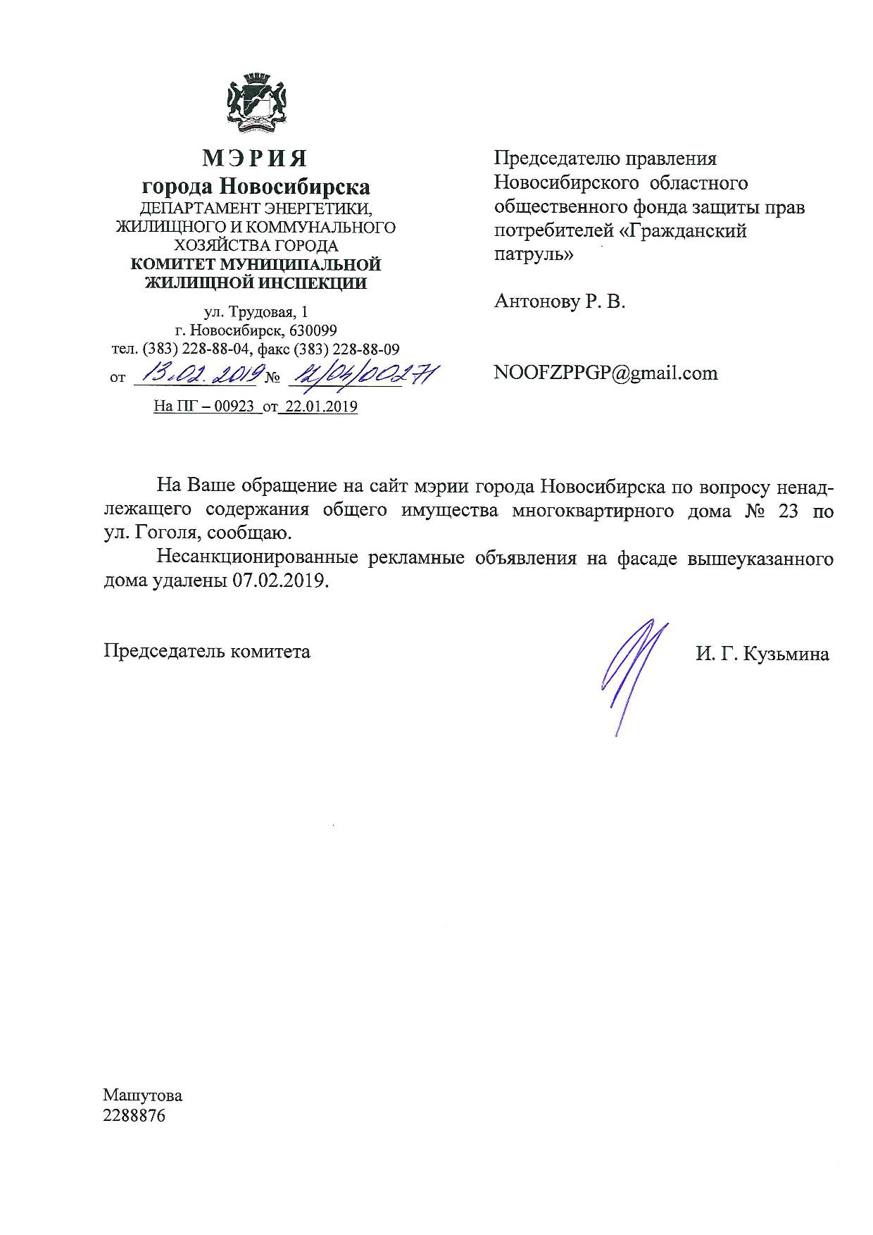 Номер жалобы:48528 Тип жалобы:Иные проблемы ЖКХ Название объекта: Регион:Новосибирская область Город:Новосибирск Адрес:улица Гоголя, 27 Описание жалобы:Объявления в неположенном месте Статус: