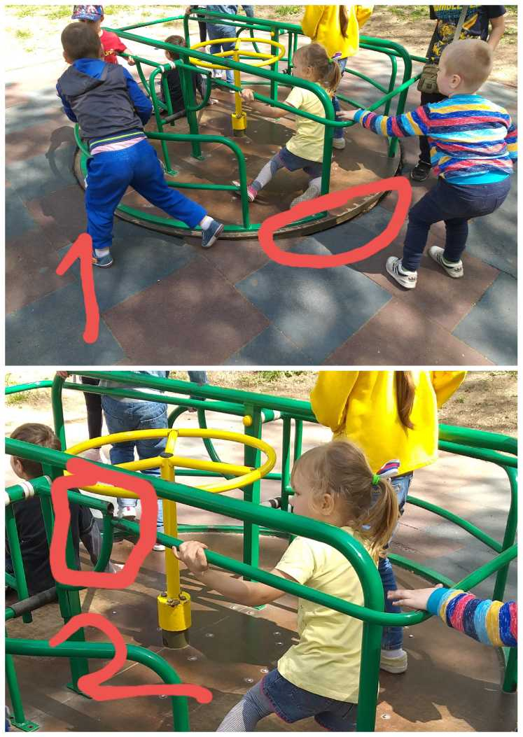 фото 1. зазор между каруселью и покрытием детской площадки ,вследствие смещения оси вращения карусели. В щель могут попасть пальцы ног, рук.